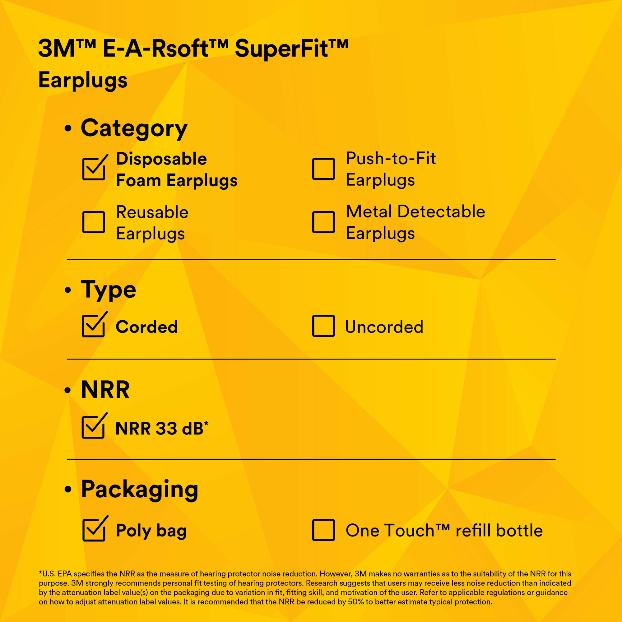 3M E-A-Rsoft SuperFit Earplugshave a tapered shape and smooth soft texture to help with comfort. A built-in orange color band serves as a training tool to help indicate insertion depth. The slow-recovery foam helps with ease of insertion.3M™ E-A-Rsoft™ SuperFit™ Earplugs' slow-recovery feature helps make inserting earplugs easier by giving the user time to insert the compressed foam cylinder (rolled down earplug) into the ear before the foam expands to fit the ear canal. Available with or with cord to suit user preference. Dispenser bottles for One Touch Pro dispenser are also available.This product is EARfit testable to help validate the level of protection the individual user is getting.