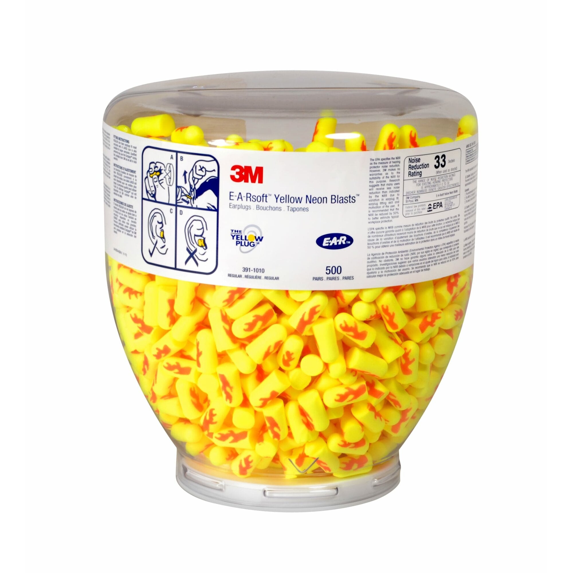 3M E-A-Rsoft Yellow Neon Blasts Earplugs seal the ear canal with soft, slow-recovery foam to help reduce noise and improve comfort. An orange-red flame and orange cord add some fun to serious hearing protection.When inserting the earplug into the ear canal, the slow-recovery foam helps make insertion easier, giving the wearer time to get the compressed foam cylinder (rolled down earplug) into the ear before the foam fully expands. High visibility neon yellow coloring makes these earplugs easy to see to verify compliance. Available with or without cord to suit user preference. Dispenser bottles for One Touch Pro dispenser are also available.This product is EARfit testable to help validate the level of protection the individual user is getting.
