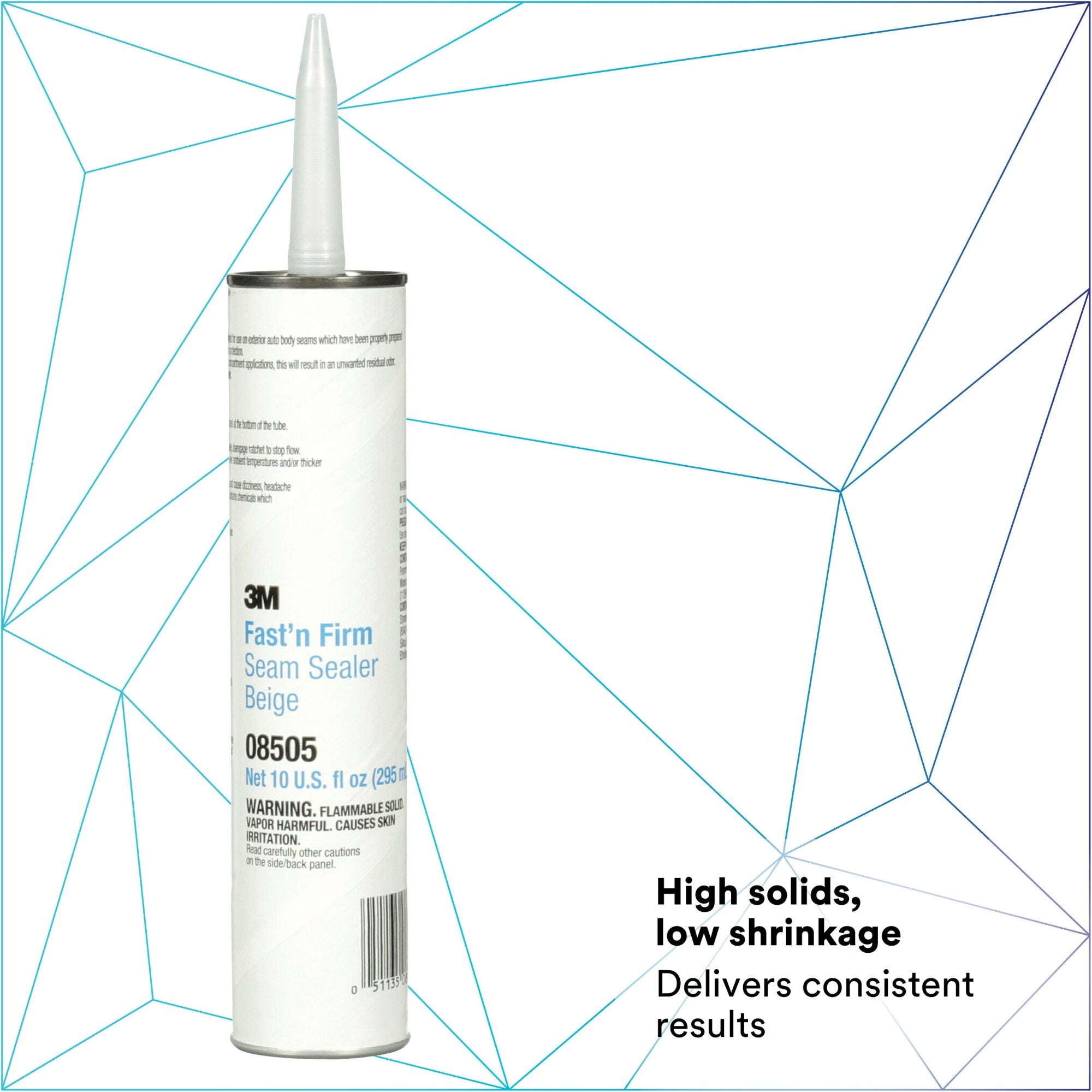 3M Fast 'N Firm Seam Sealer is a fast setting seam sealer designed for sealing exterior joints and seams. This sealer adheres well to clean primed or painted metal. This product comes in a 1/10 gallon cartridge. If saving time and boosting productivity are important, this seam sealer is an ideal choice. It is paintable in only 45 minutes.Fast Curing Sealer Boosts Productivity