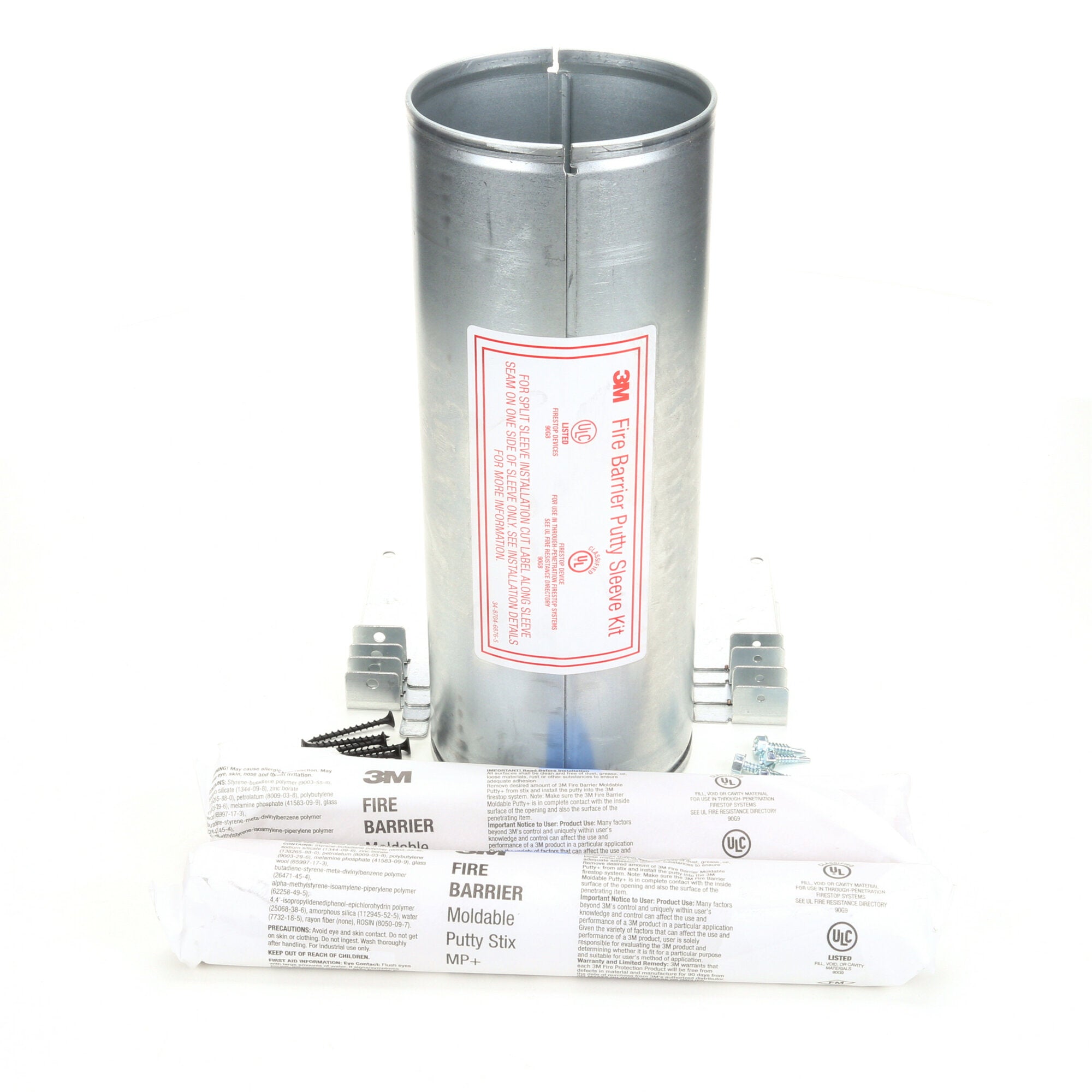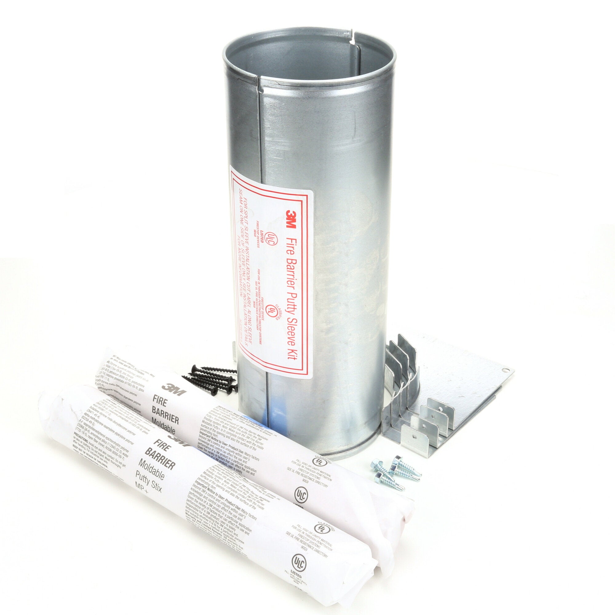 Each kit comes complete in a box containing a 3M™ Fire Barrier Putty Sleeve (two-part metallic sleeve with set of two-part metallic flanges), 3M™ Fire Barrier Moldable Putty+, sheet metal screws, drywall screws and two installation identification labels. These kits can be used as a one-piece sleeve or the sleeve may be split/ hinged for existing cable installations. A versatile and economical solution, these putty sleeve kits are able to meet application requirements in such a way that help reduce inventory.