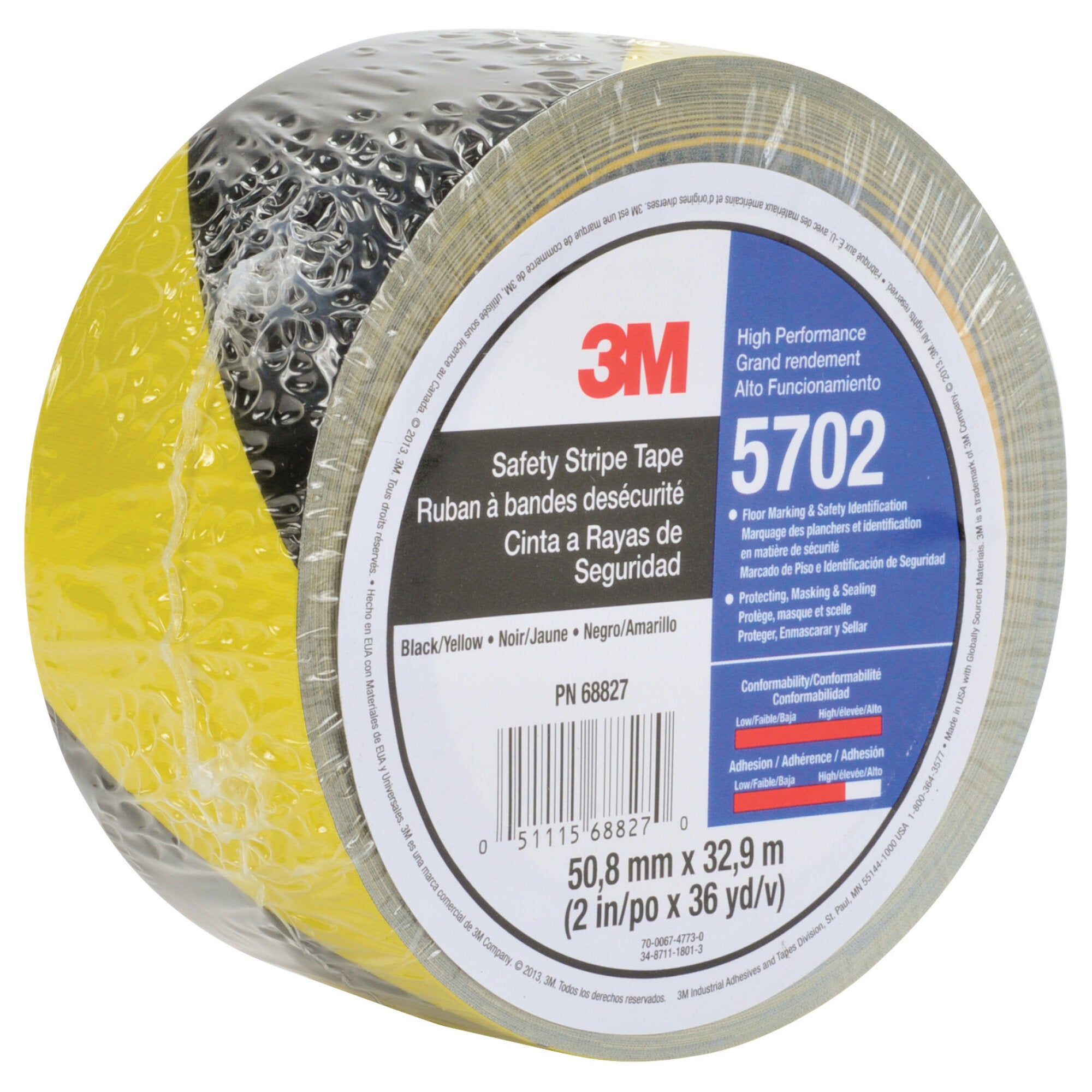 Developed to provide highly visible safety indication for driving and walking lanes, hazardous areas, protruding equipment and low hanging objects, durable 3M Safety Stripe Tape 5702 is an ideal choice for your applications. The color is embedded into the vinyl backing to resist abrasion, scuffing and moisture which might affect visibility. Designed with unique stretch properties, this tape conforms to irregular, curved and convex surfaces while remaining stretched and without lifting after application. The rubber adhesive has quick stick and excellent holding strength on most surfaces. This combination of the backing and adhesive properties help to prevent edge lifting, keeping the tape in place. The tape removes cleanly in one piece from most surfaces to help reduce clean-up and labor costs.Rubber Adhesive Sticks on Contact Mark and identify safety hazards with our black and yellow 3M™ Safety Stripe Vinyl Tape 5702. Designed with unique stretch properties, this tape conforms to irregular, curved and convex surfaces while remaining stretched and without lifting after application. The rubber adhesive has quick stick and excellent holding strength on many surfaces. This combination of the backing and adhesive properties help to prevent edge lifting, keeping the tape in place. The tape removes cleanly in one piece from most surfaces to help reduce clean-up and labor costs. Use our 3M™ Lane Marking Applicator M1 to quickly and easily apply this tape without crawling around on the floor. Recommended Applications 3M™ Safety Stripe Vinyl Tape 5702 is designed for a variety of applications in factories, warehouses, hospitals and public areas such as: • Lane and safety marking • Identify hazard areas Rugged Versatility without the Mess 3M Vinyl tapes are used to clearly mark lanes, corridors and hazardous or “no-go” areas in factories, warehouses, and hospitals. Using our vinyl tape for lane marking is a faster, more versatile and less costly option than painting, which often requires ventilation, time consuming prep and clean-up processes. Since durability is essential in the workplace, we’ve engineered 3M™ Safety Stripe Vinyl Tape 5702 to resist most common solvents, acids and alkaline chemicals. For best results avoid exposure to ketones, esters and chlorinated hydrocarbons, and apply to a clean, dry surface at temperatures between 60°F (16°C) to 80°F (27°C).