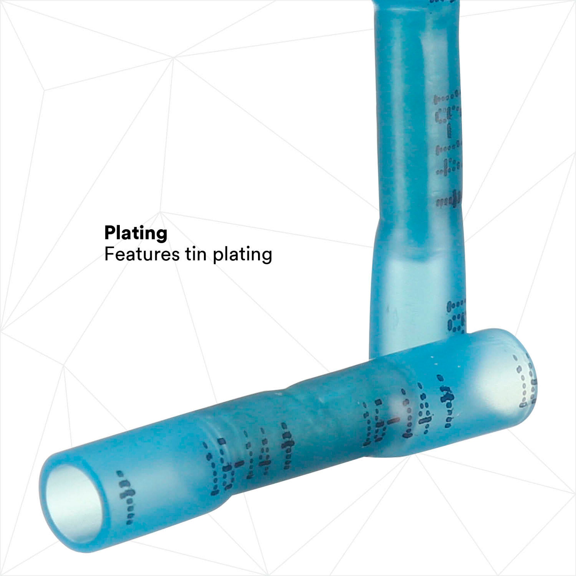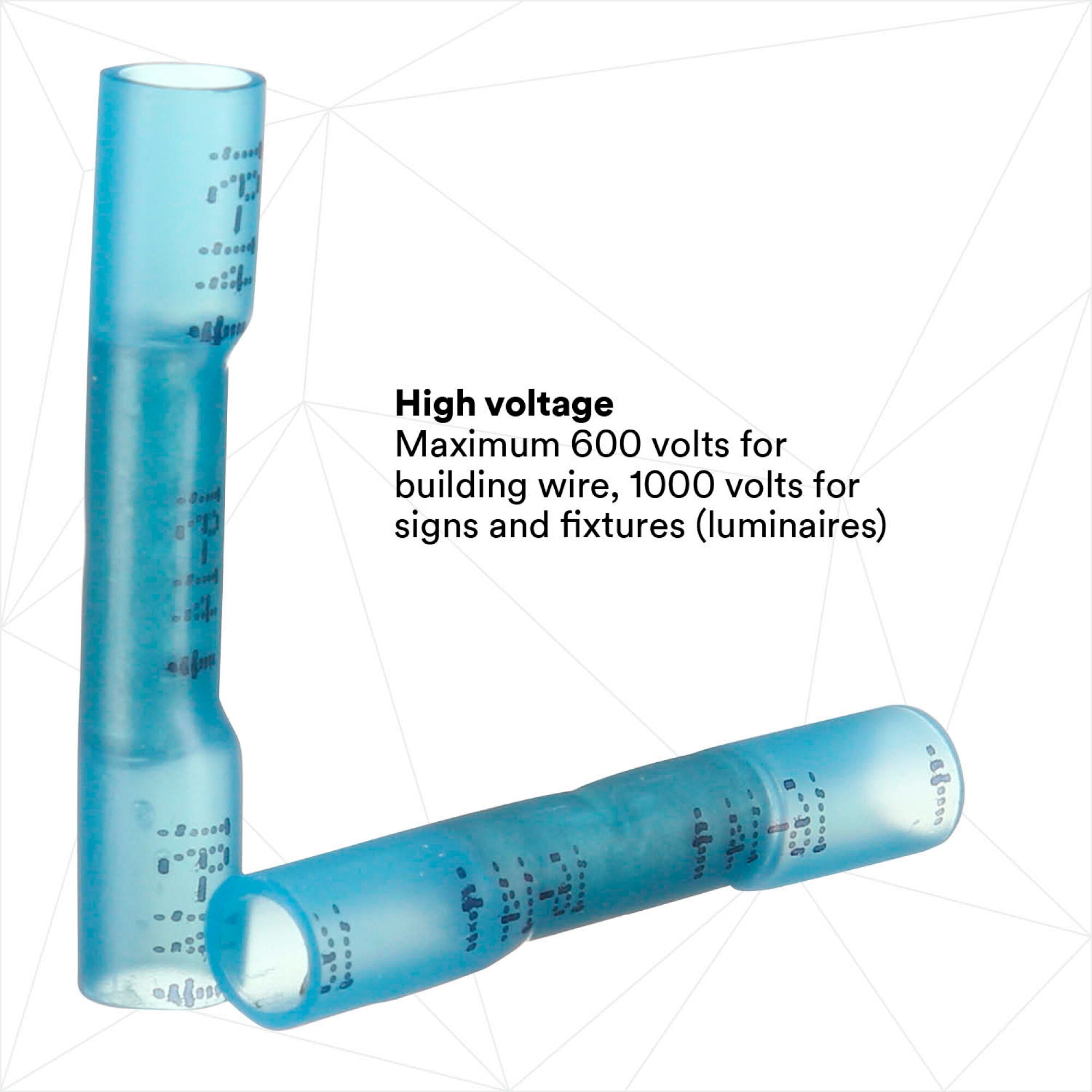 3M Scotchlok Heat Shrink Butt Connector ensures an ideal fit with great performance. It withstands a maximum temperature of 221 degrees F (105 degrees C). Electrolytic copper construction offers good conductivity and a tin-plated finish resists corrosion.3M™ Scotchlok™ Heat Shrink Butt Connector is color-coded for quick and easy identification of the wire size required. This versatile connector has a seamless barrel that is covered by see-through, pre-insulated transparent tubing to provide seal resistance to water, salt and other contaminants when crimped and shrunk. The heat shrink tubing offers better pullout strength and strain relief when shrunk.