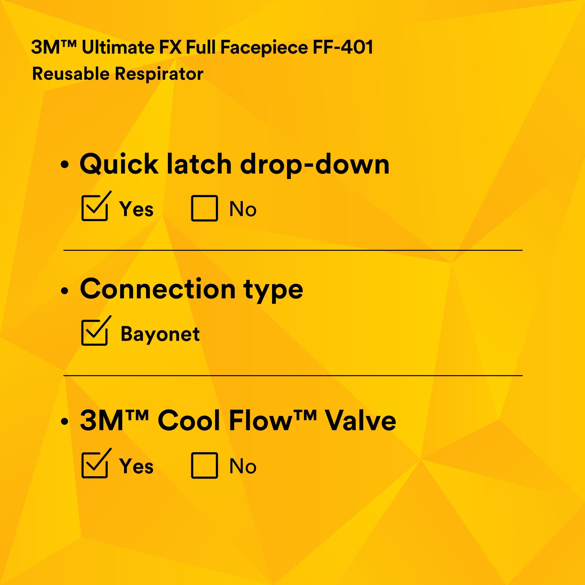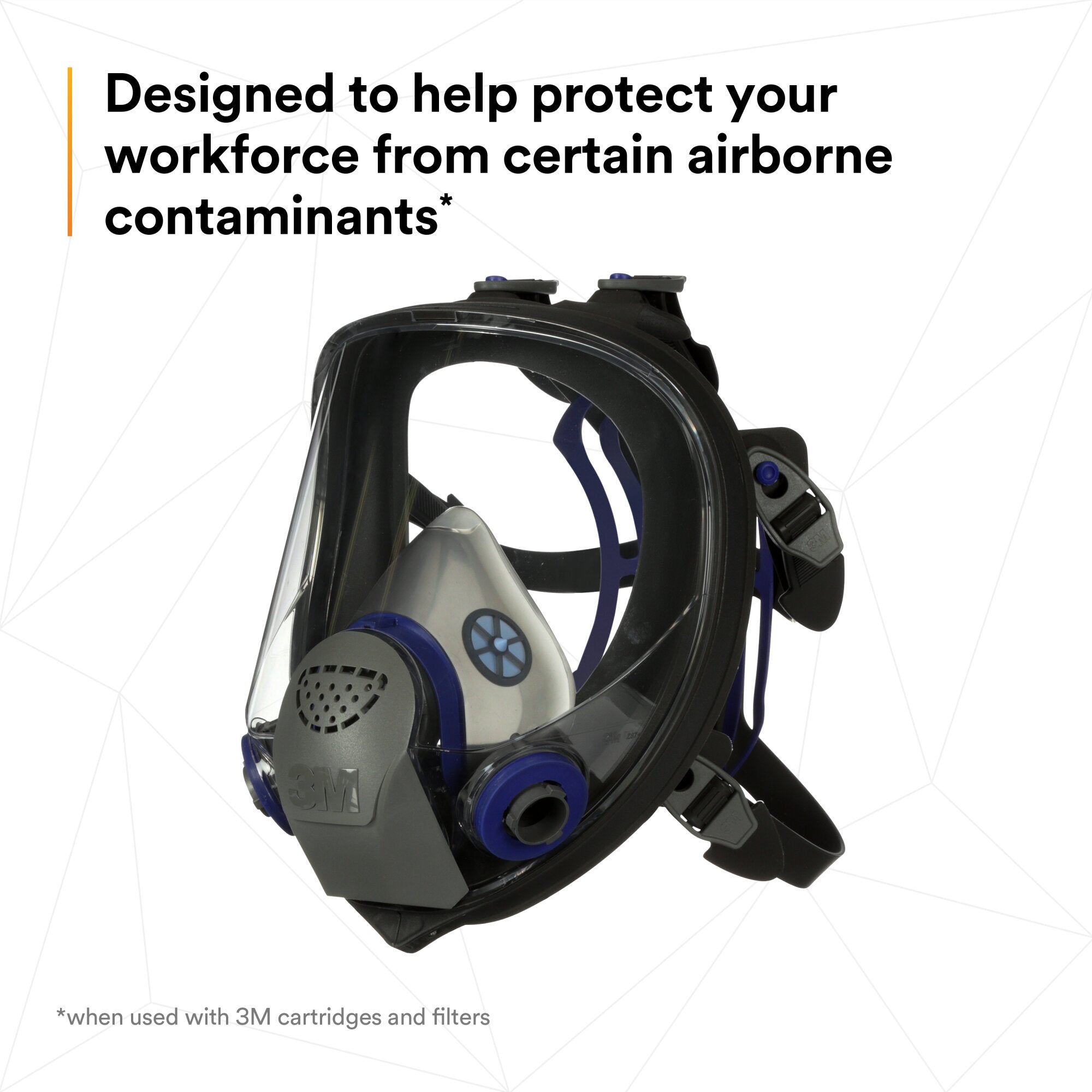 Designed to help protect your workforce from certain airborne contaminants when used with 3M cartridges and filters, the3M Ultimate FX Full Facepiece Reusable Respirator FF-400Series helps protect your employees from many respiratory hazards in a variety of environments.Durable, versatile protection Designed with a large lens that's coated with Scotchgard™ Protector, the Ultimate FX FF-400 respirator offers a wide viewing range, ideal for spray-paint applications and more. The six-strap head harness is designed to withstand tough work conditions. This full face respirator is compatible with a wide range of 3M filters, cartridges, powered and supplied air systems, making it a go-to choice for health and safety managers. Premium comfort We designed this respirator with a soft, flexible nose cup and face seal so your employees can stay focused on the task at hand. A comfort cradle helps postion the head suspension more comfortably on the back of the wearer's head. We also equipped this facepiece with our proprietary 3M™ Cool Flow™ Exhalation Valve.