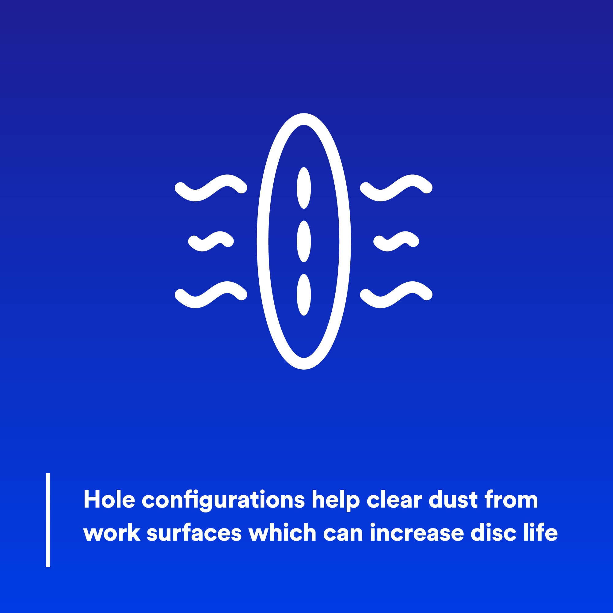 • Hole configurations help clear dust from the work surface, increasing disc life