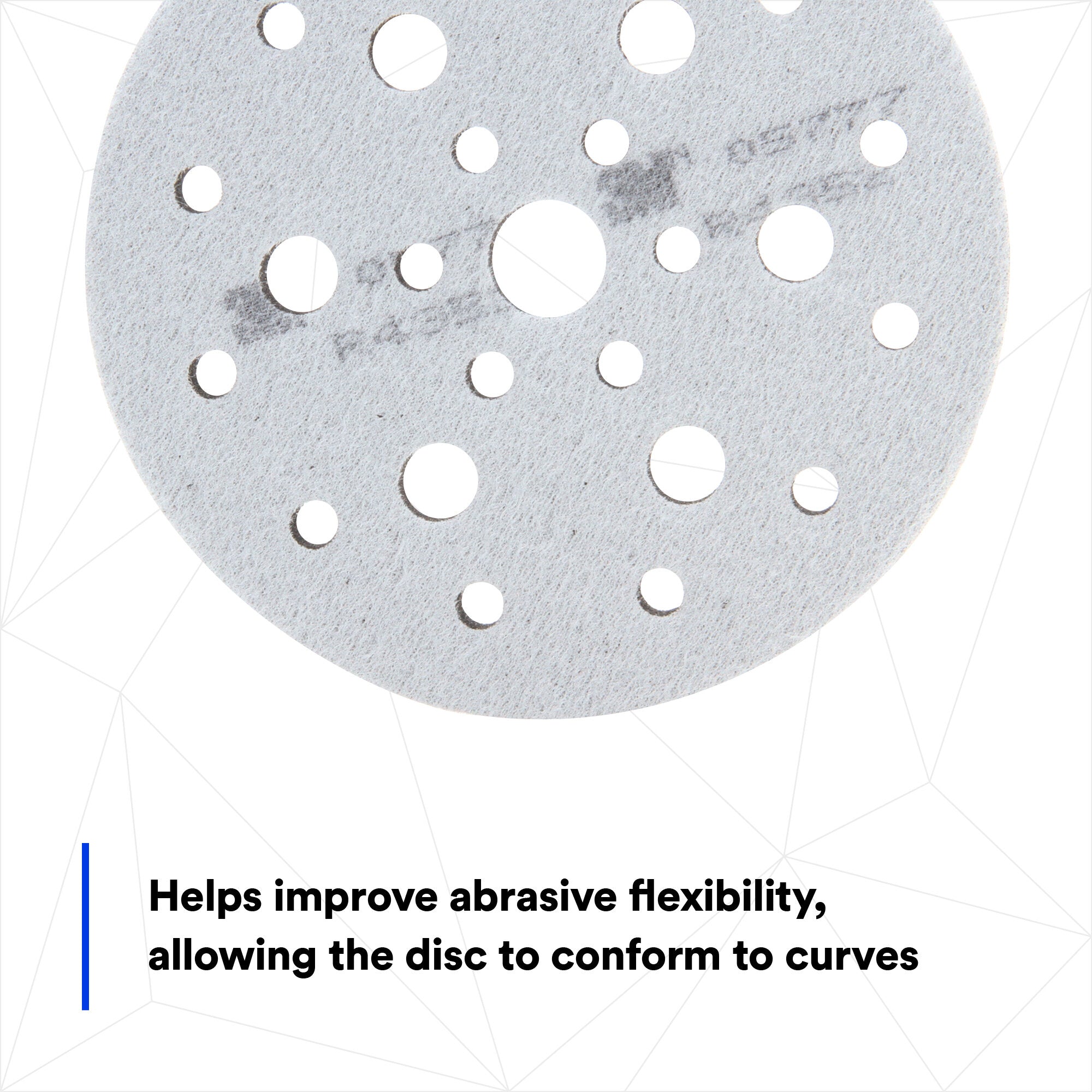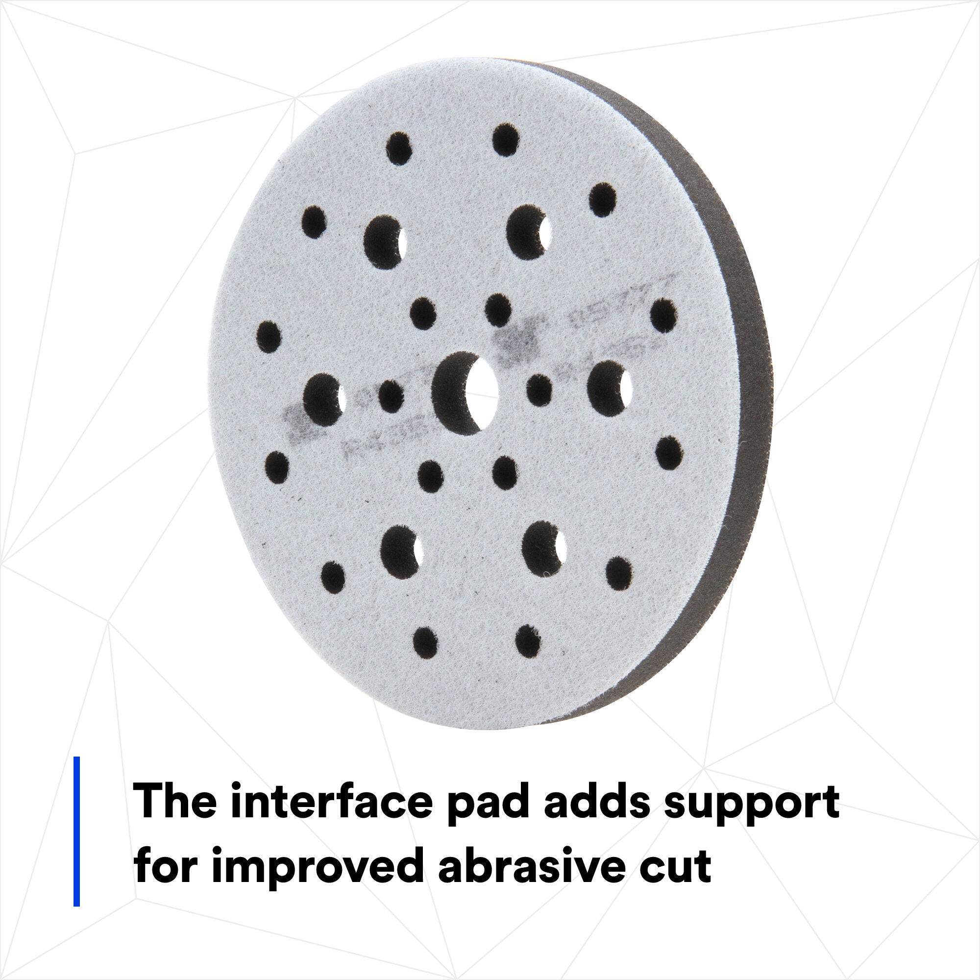 This soft density foam 3M Hookit Soft Interface Pad adds cushion and conformability to 3M Hookit back-up pads for auto body sanding applications requiring precision across uneven surfaces. It increases abrasive cut and enables more consistent contact of abrasive discs around surface contours, plus the pad allows closer sanding to edges for smoother, more refined finishes.