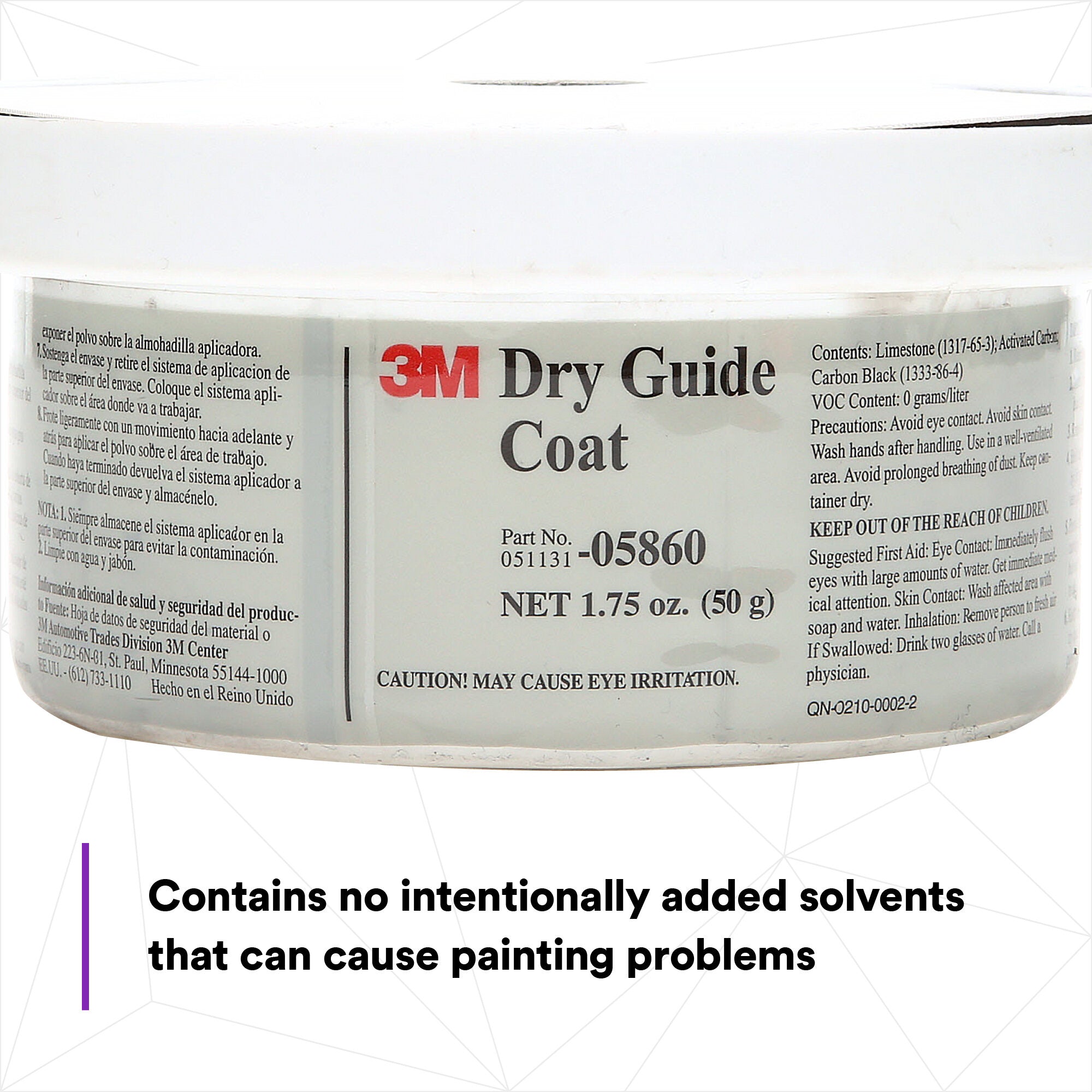 3M Dry Guide Coat is used to identify surface imperfections such as pinholes in body filler and deep scratches in primer. Unlike liquid and aerosol guide coats, Dry Guide Coat requires no masking before use, and there is no dry time after application. The dry formula contains no intentionally added solvents and doesn't clog sandpaper while delivering easier cleanup.Reveal Imperfections that Escape the Unaided Eye