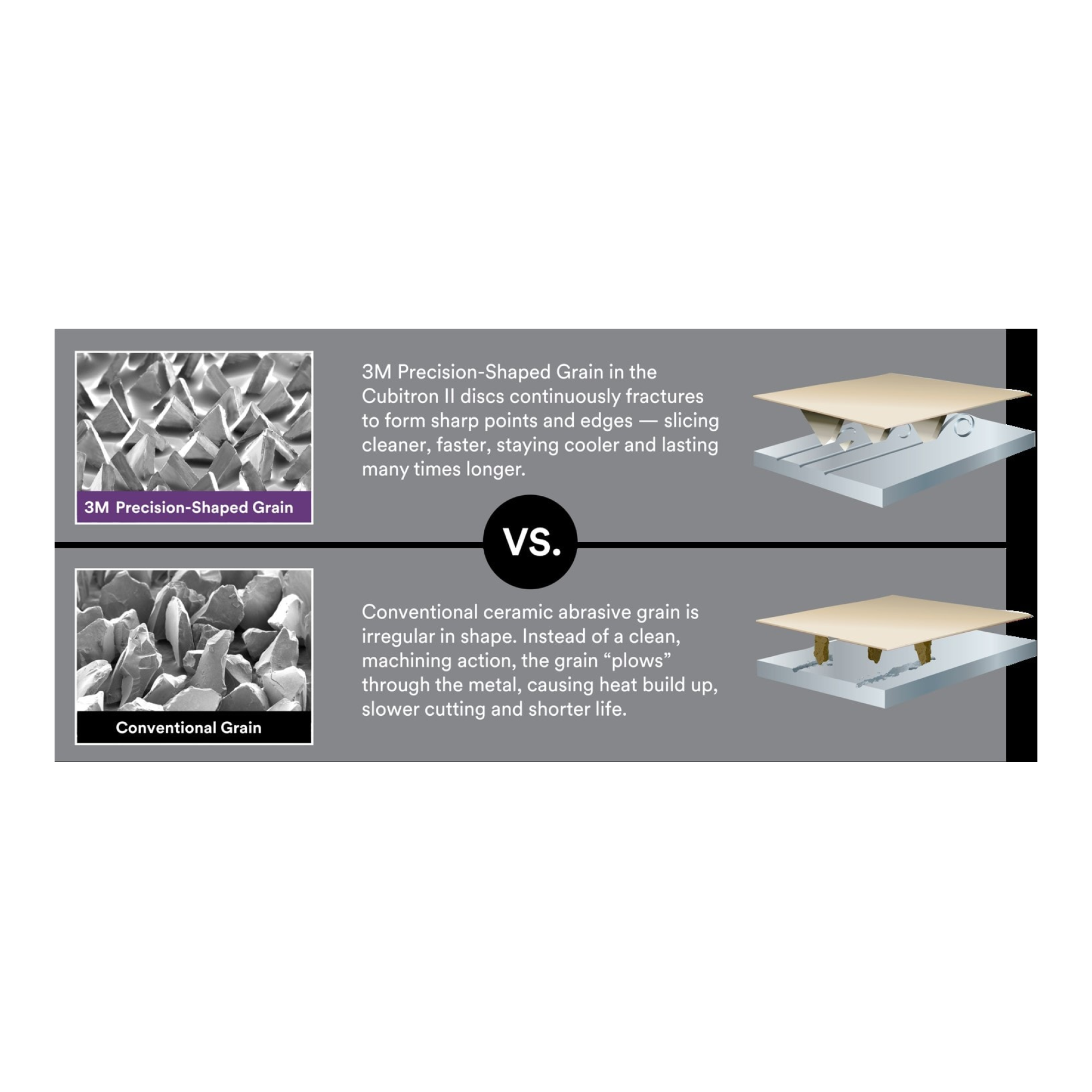 3M™ Cubitron™ II Flap Disc 969F features our proprietary 3M Precision-Shaped Grain – a grain design that continually fractures into sharp points that slice cleanly through metal, unlike traditional abrasives which tend to plow through the substrate. The grains fracture evenly and continuously to expose new sharp edges to keep the disc cutting efficiently. The result is that 3M™ Cubitron™ II products out-cut and outlast conventional ceramic industrial abrasives.