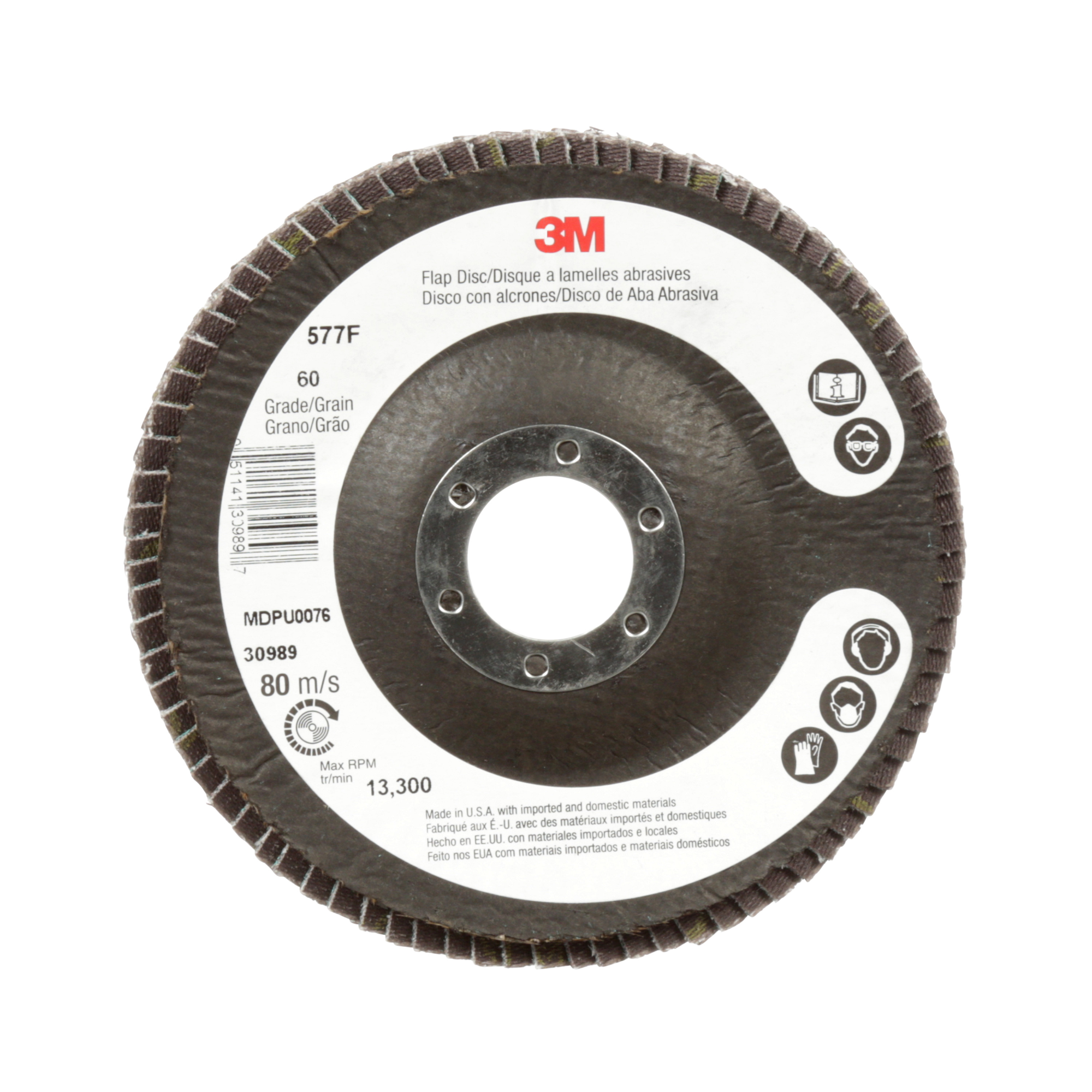 3M Flap Disc 577F tackles the toughest high-pressure metalworking applications and leaves a blended finish, all in a single step. This abrasive flap disc features fast-cutting alumina zirconia mineral on durable polyester-backed flaps for extra cutting power, and long life on heavy duty applications such as weld removal, sharp-edge work, and beveling.Ideal for tough grinding applications where final finish is important, the overlapping layers of the flaps on 3M™ Flap Disc 577F continually wear away with use to expose fresh abrasive mineral for a fast, consistent cut, while the cushioning of the flaps creates a blended finish. Flap discs typically generate a finish one grade finer than the disc is graded, reducing finishing steps. A grinding aid reduces grinding temperatures for processes involving heat-sensitive alloys such as stainless steel, nickel alloys, and titanium.