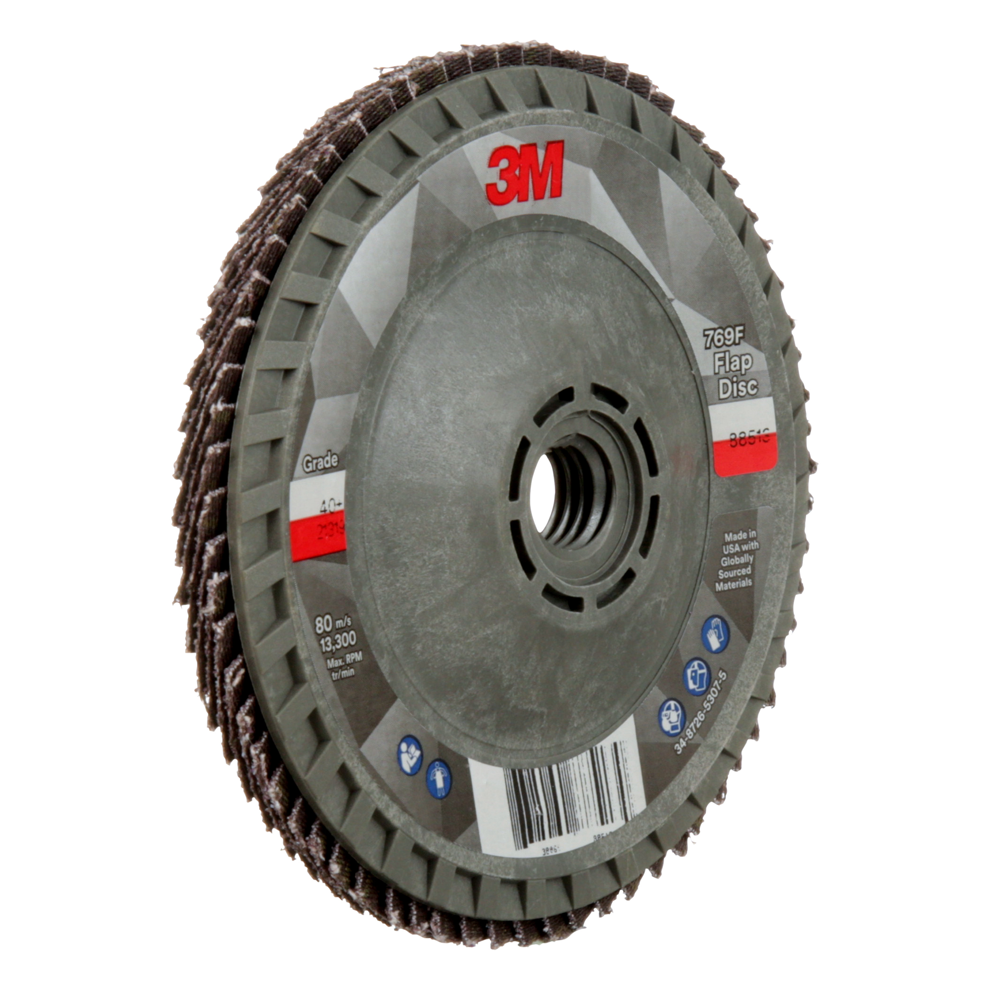 The 3M™ Flap Disc 769F features a blend of 3M Precision-Shaped Grain – our proprietary grain design that continually fractures into sharp points that slice cleanly through metal, unlike traditional abrasives which tend to plow through the substrate. This fracturing helps our 3M™ Flap Disc 769F last long and maintain a high cut-rate over the life of the disc.