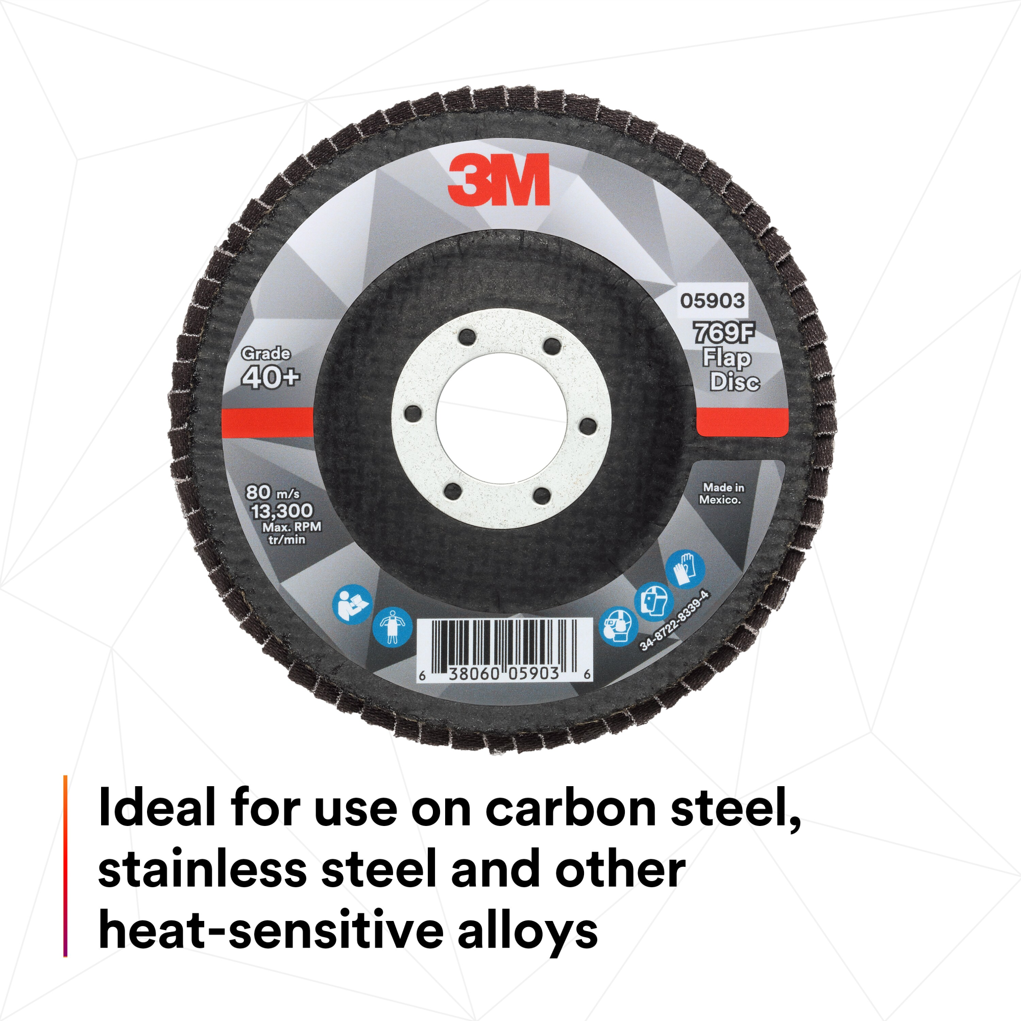 The 3M™ Flap Disc 769F features a blend of 3M Precision-Shaped Grain – our proprietary grain design that continually fractures into sharp points that slice cleanly through metal, unlike traditional abrasives which tend to plow through the substrate. This fracturing helps our 3M™ Flap Disc 769F last long and maintain a high cut-rate over the life of the disc.