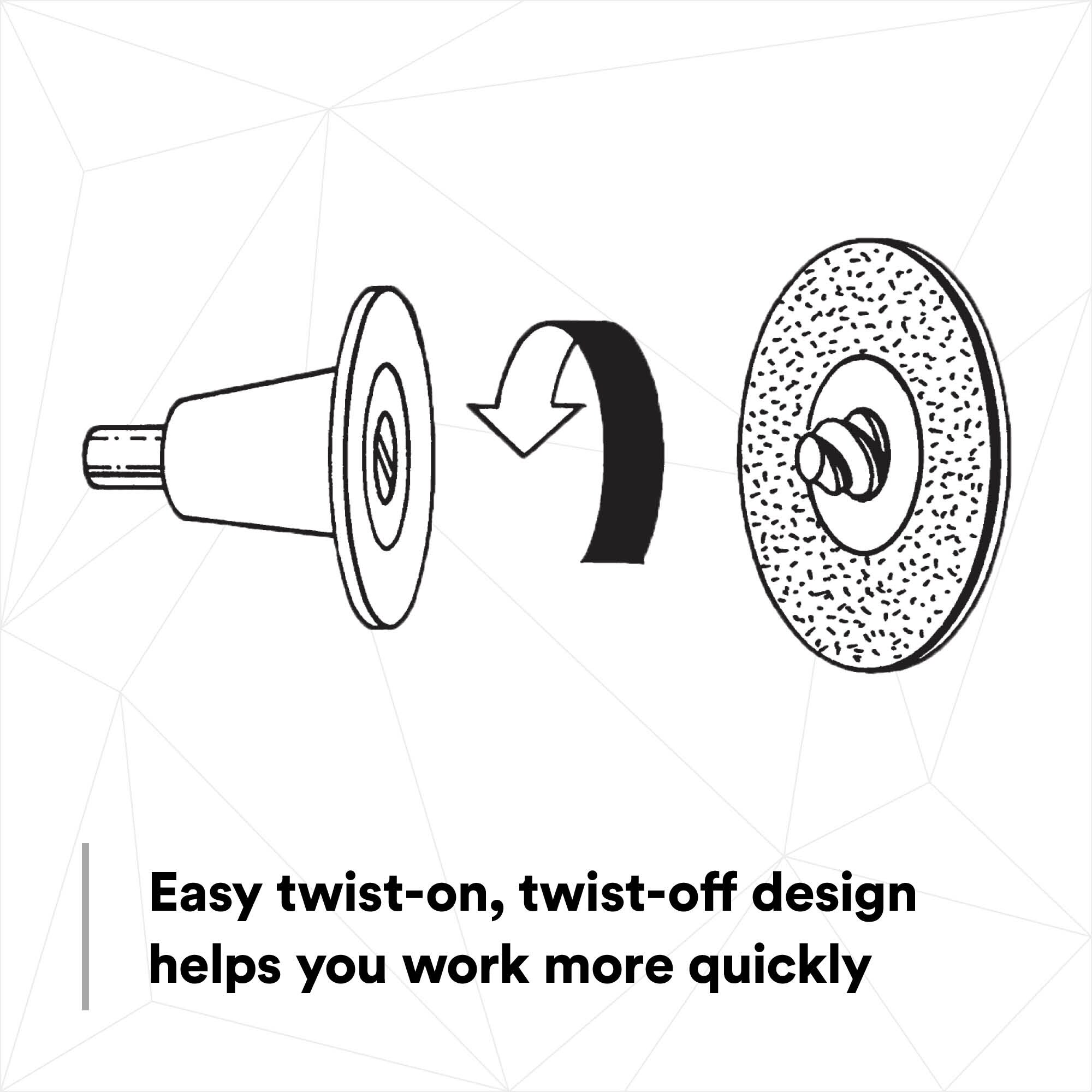 3M’s Roloc™ attachment system provides a quick yet secure method of attaching a wide variety of quality abrasive discs to rotary tools. Each Green Corps Abrasive Disc has a plastic threaded button that is color-coded by its grade, making it easy to select the right disc for the application at a glance. The disc screws into a disc pad or disc holder (sold separately) with a short twist, and is removed just as easily. The disc pad or disc holder can be used with any standard 1/4” drill or air tool. This simple assembly provides a secure attachment that is reliable even when working at high speeds. It saves time, too: operators can conveniently change the discs with the same simple twist-off, twist-on motion, and swap grades and jobs in seconds.