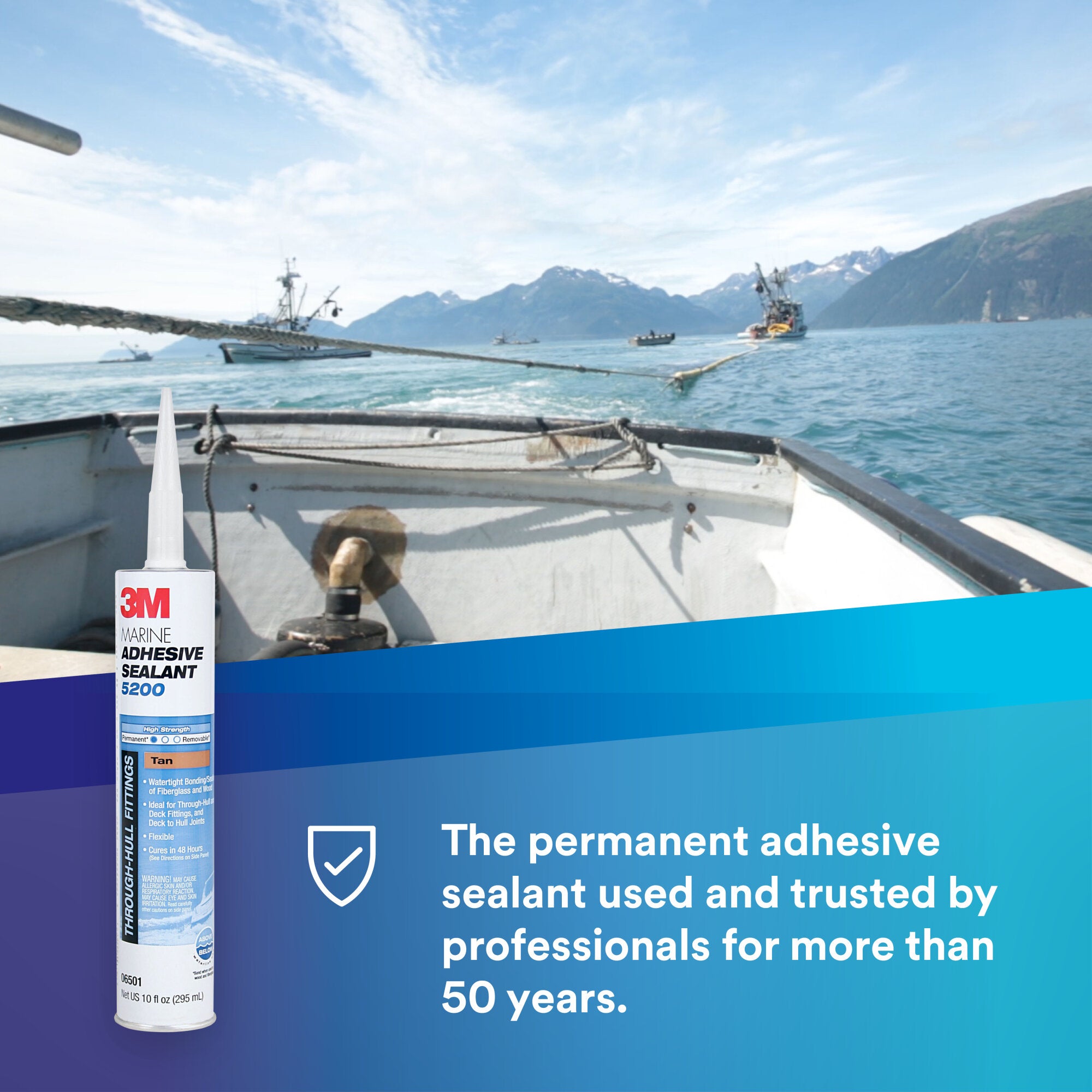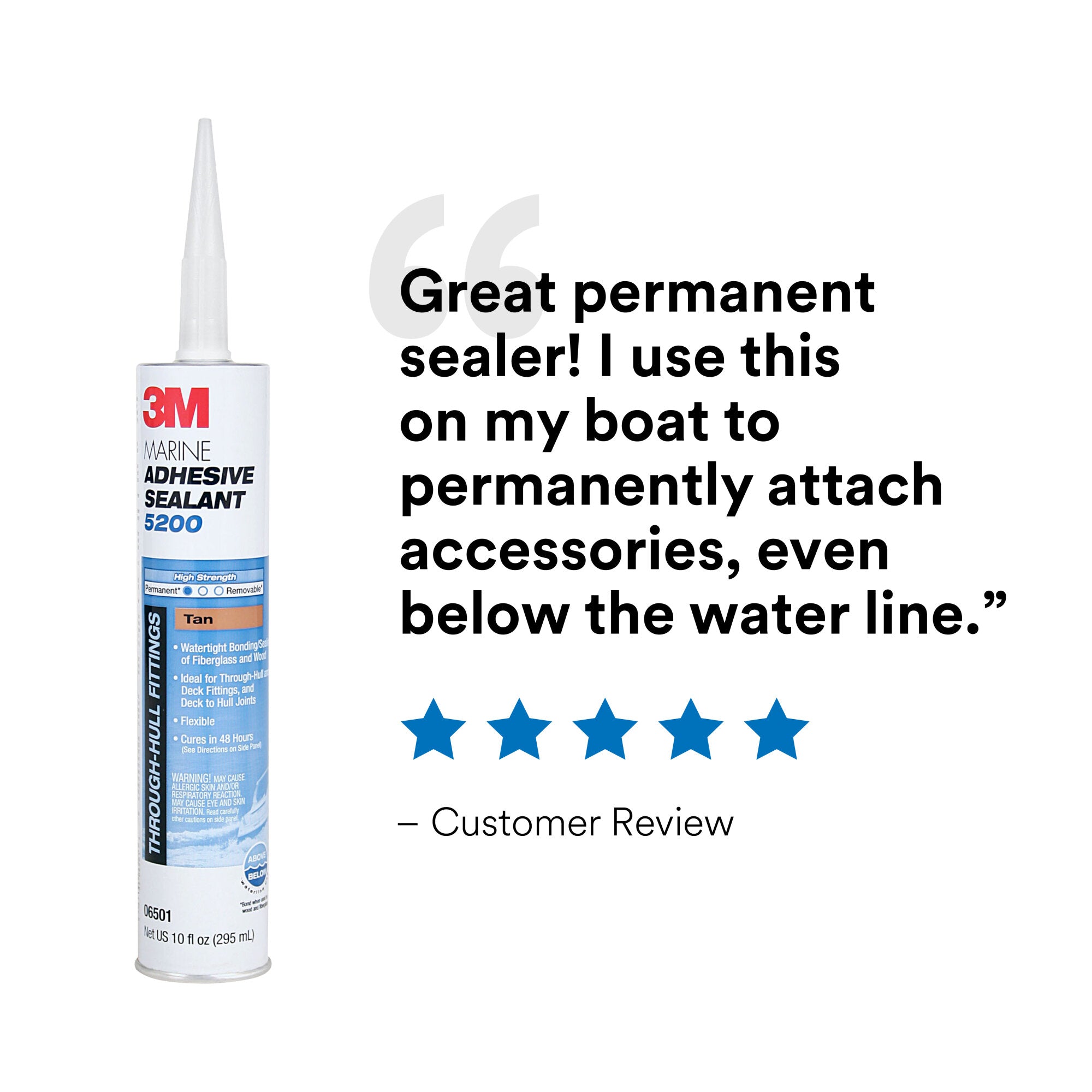 3M™ Marine Adhesive Sealant 5200 Fast Cure is designed to meet the high demands of the marine environment, making it ideal for creating tough bonds above and below the water line. We formulated our sealant to provide an exceptionally strong solution for marine conditions as well as flexibility that combats vibrations, swelling, shrinking or shock. Once again, despite the barriers of a rough marine environment, 3M looked to science to provide a reliable, durable solution.