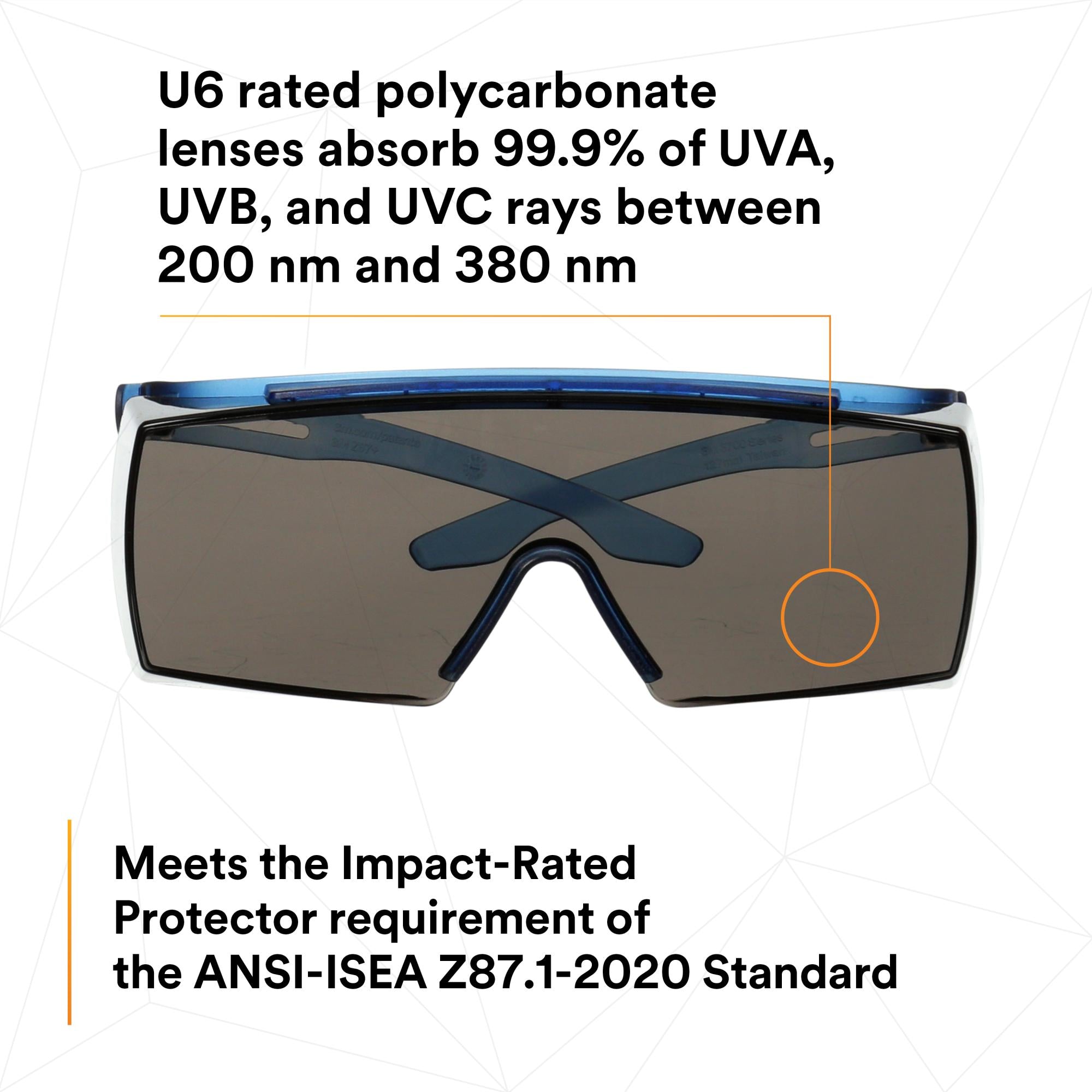 • U6 rated polycarbonate lenses absorb 99.9% of UVA, UVB, and UVC rays between 200 nm and 380 nm
