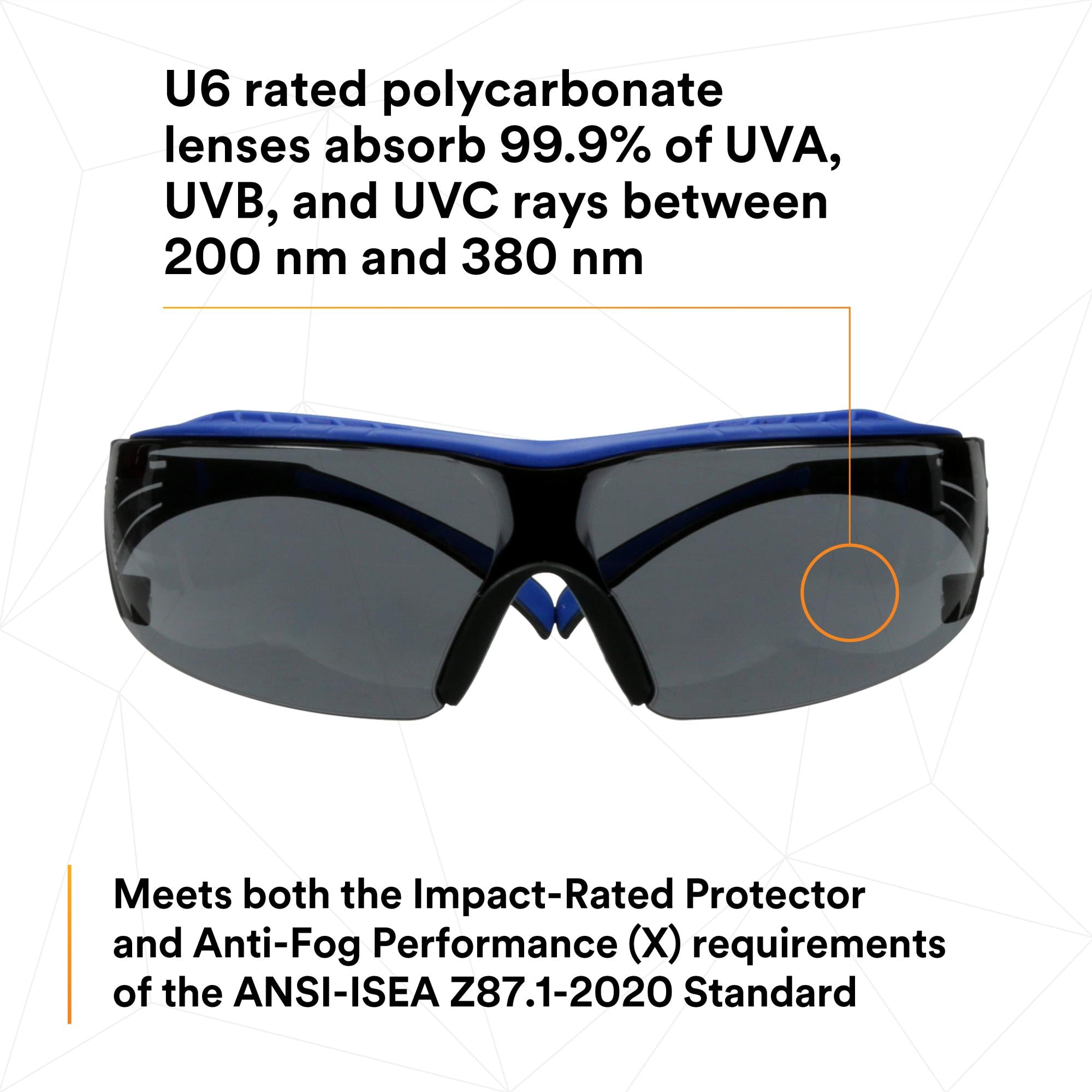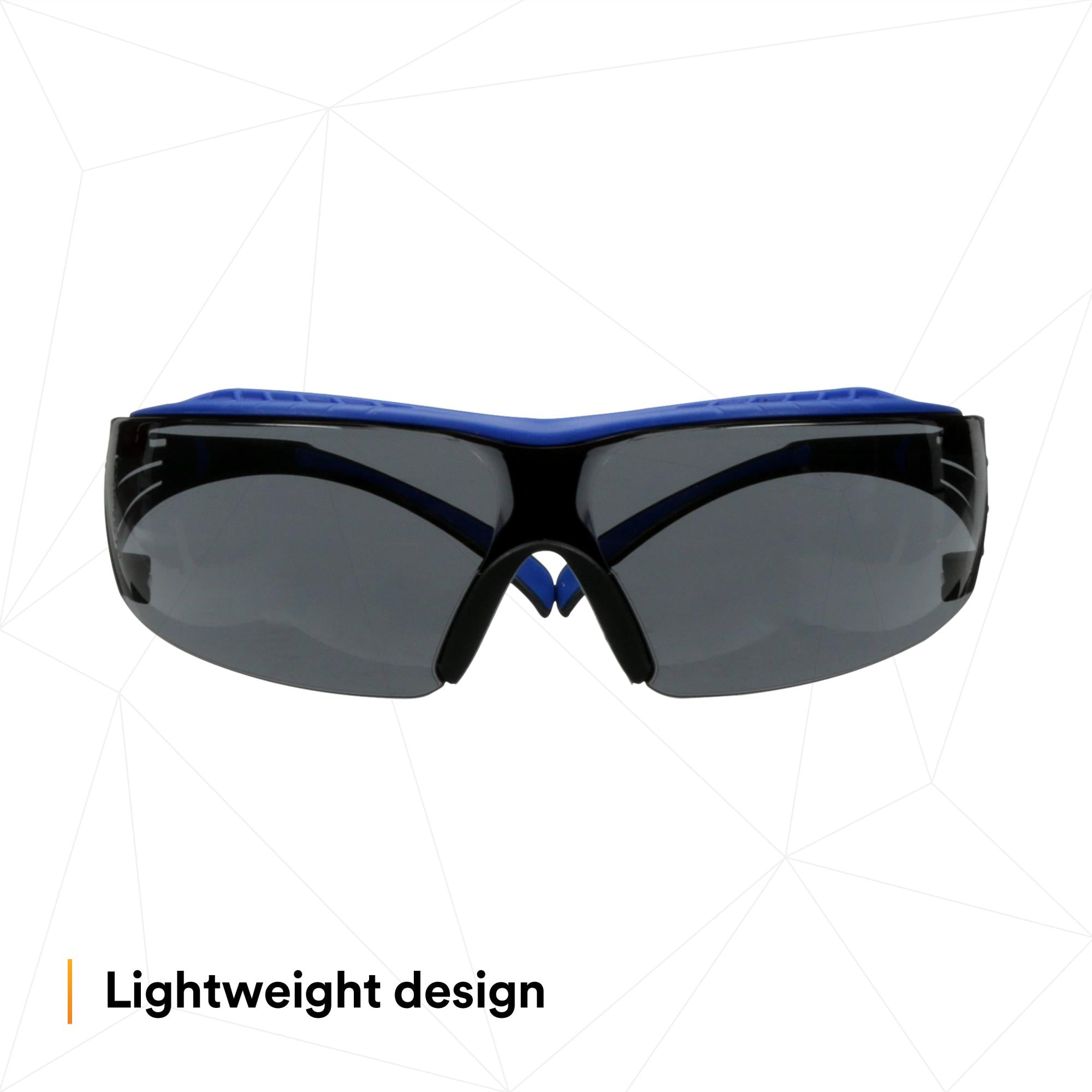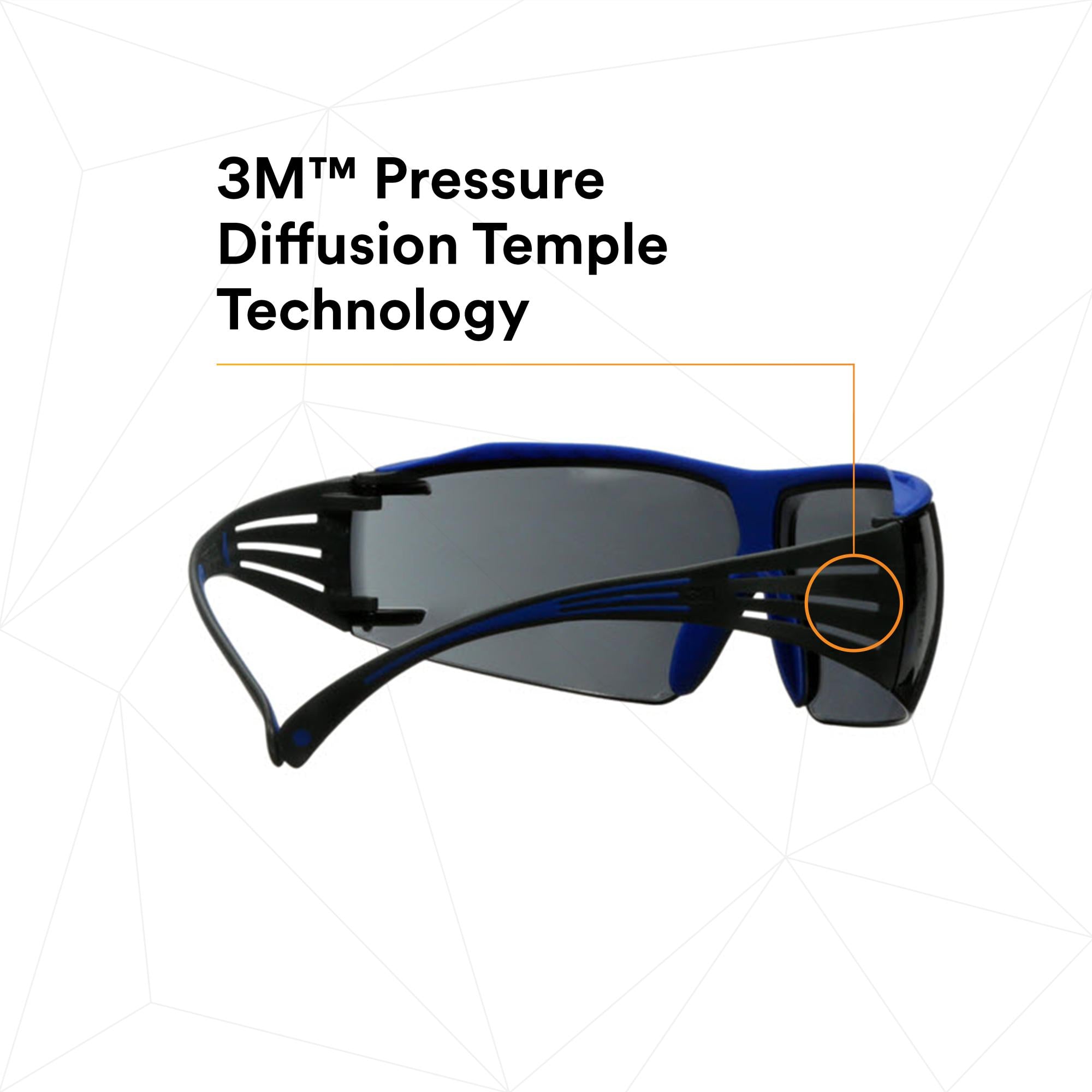 For lightweight eye protection designed for comfort and performance, use 3M SecureFit Safety Glasses 400X Series. Our safety glasses weigh just 22 g and have a contemporary, stylish look. 3M Pressure Diffusion Temple Technology offers a comfortable fit, with wide, flexible temple arms over the ears that provide solid side protection and padding for increased comfort. The soft nose bridge and contoured brow guard rest comfortably against the forehead to help provide additional protection from flying particles, and the wraparound design gives the user a wide field of vision as well as reducing slippage from head movements. These glasses combine well with ear muffs.