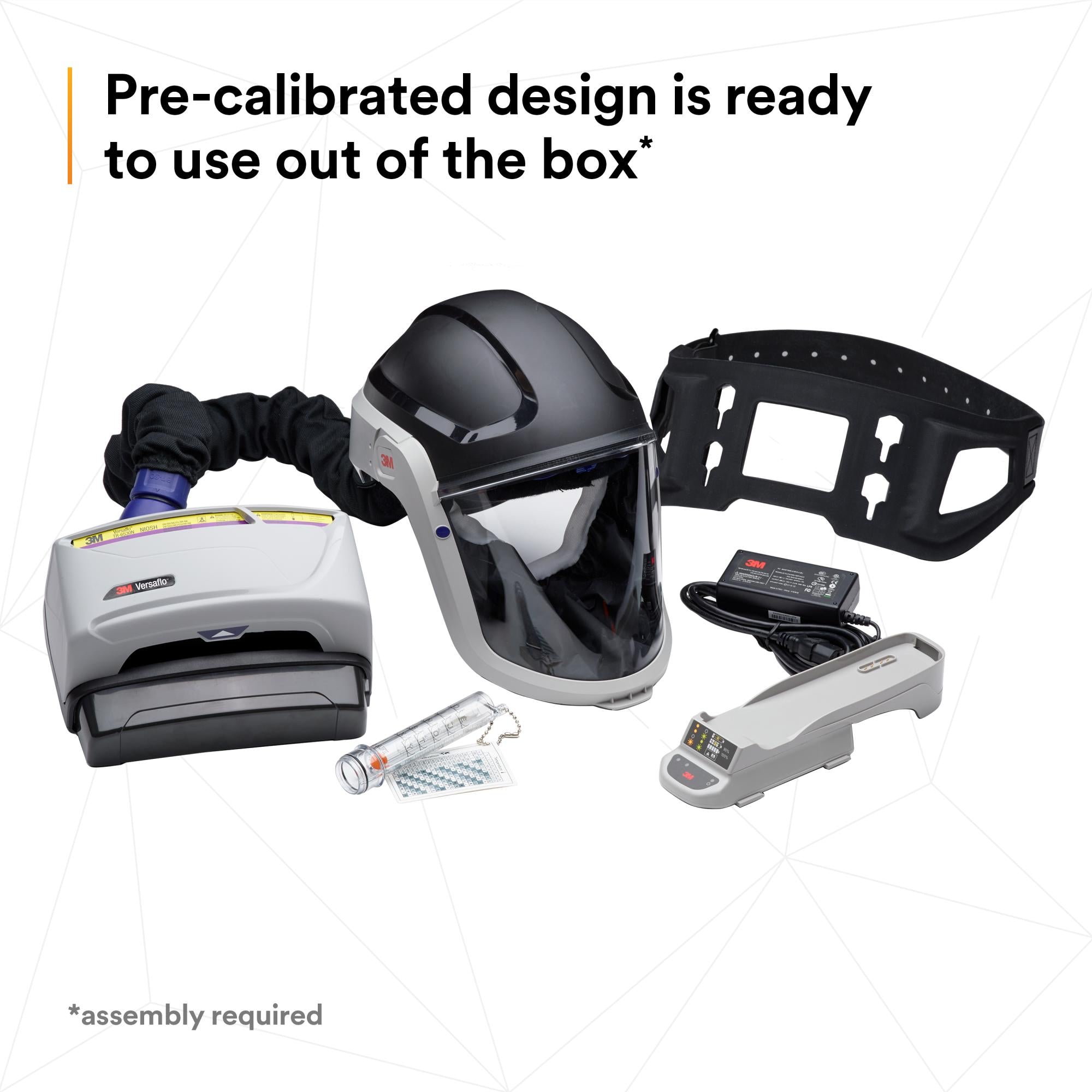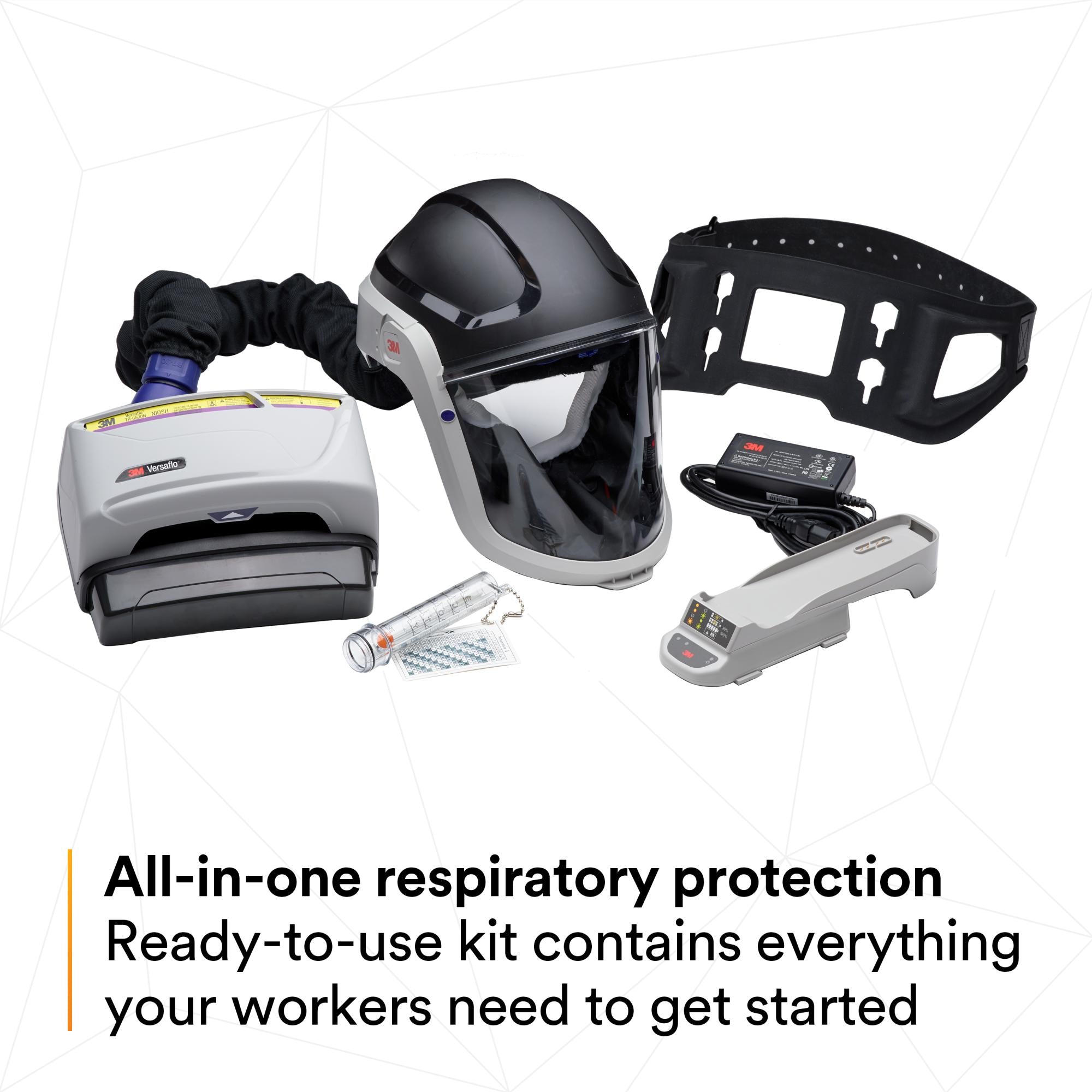 PAPR Unit TR-602N, Respiratory Hard Hat Assembly M-307, Organic Vapor/Acid Gas/HEPA Cartridge TR-6530N, Filter Cover TR-6500FC, High Capacity Battery TR-632/37348(AAD), Single Station Battery Charger Kit TR-641N/37350 (AAD), Single Station Power Supply TR-941N, Length Adjusting Breathing Tube BT-30, High Durability Belt TR-626, Prefilter TR-6600/37354(AAD), Spark Arrestor TR-662, High Temperature Breathing Tube Cover BT-926/L-199SG, Air Flow Indicator TR-971, Cleaning & Storage Kit TR-653/37373(AAD)