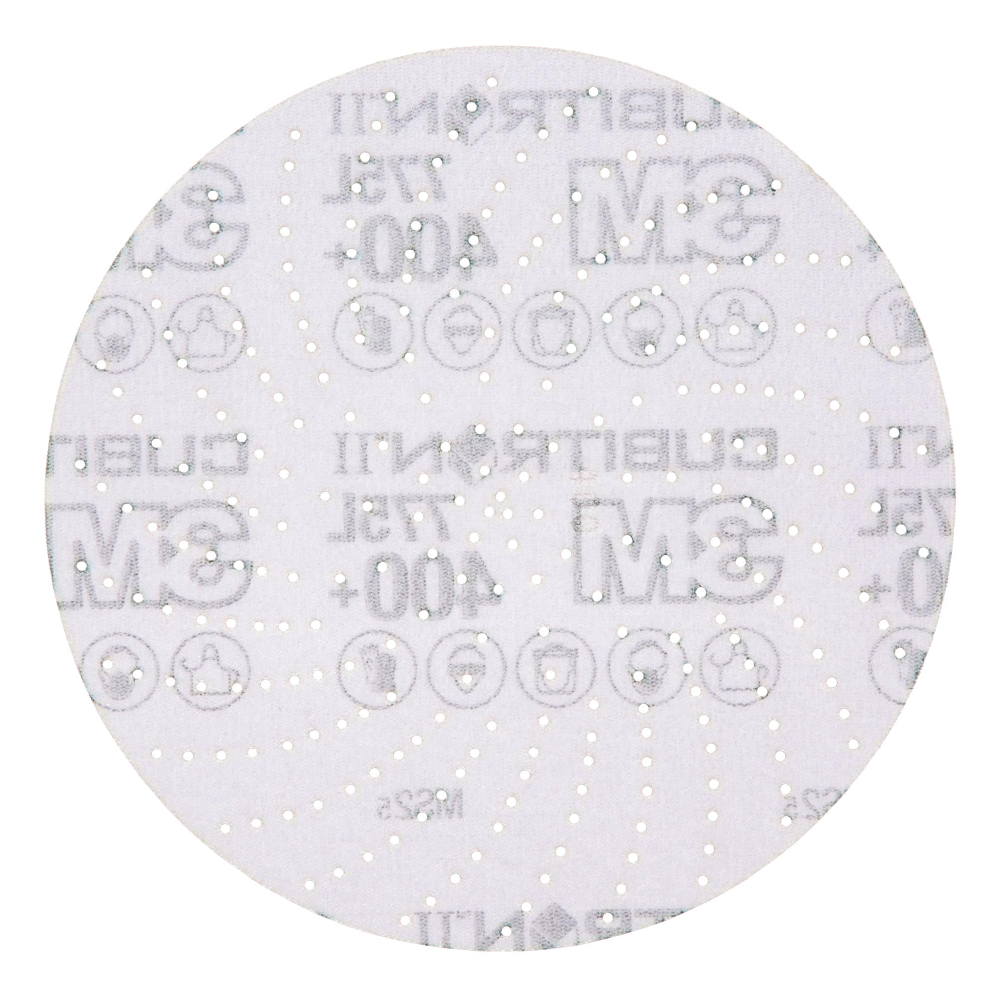 3M Xtract Cubitron II Disc 775L features a 3M proprietary multi-hole pattern for improved dust extraction in finishing applications. Part of the 3M Xtract Series, designed for optimal dust removal. An innovative multi-hole pattern extracts dust better than 5- or 6-hole products increasing cut and dramatically increasing disc life. The design does not need to align with the disc pad holes, making switching the discs fast, easy and convenient. Featuring ceramic 3M Precision-Shaped Grain, a revolutionary advancement in abrasive technology. The triangular shaped ceramic mineral is designed to slice through the substrate, rather than gouging or plowing like conventional abrasives, resulting in a disc that cuts up to 2x as fast as conventional abrasives. The film backing delivers outstanding tear resistance, flexibility and a consistent, uniform finish on a variety of substrates.These discs are ideal for a broad range of applications focused primarily on stock removal, and are effective on a wide variety of substrates, including metals, composites, gelcoat, and whitewood. The film backing offers greater tear resistance than paper discs, for additional durability and edge retention. For best results, pair with 3M Xtract™ Random Orbital Sanders. Open coat construction means the abrasive grains are placed with space between them to help evacuate dust and other sanding debris and avoid clogging the cutting edge of the grains. The load-resistant coating allows the disc to continue cutting even when sanding softwoods, paints, and other materials that would, otherwise, clog the disc and hinder sanding ability. All of this adds up to increased productivity and reduced material consumption. Sandpaper discs cut better and last longer when dust isn't loading the cutting surface of the abrasives. Our proprietary multi-hole pattern on 3M Xtract™ products removes dust at a higher rate than 5- or 6-hole products. This hole design doesn't even require alignment of holes with the disc pad, making disc changes quick and simple. For maximum dust extraction, use this disc with a 3M Xtract™ Back-up pad and a random orbital sander with vacuum (both sold separately).