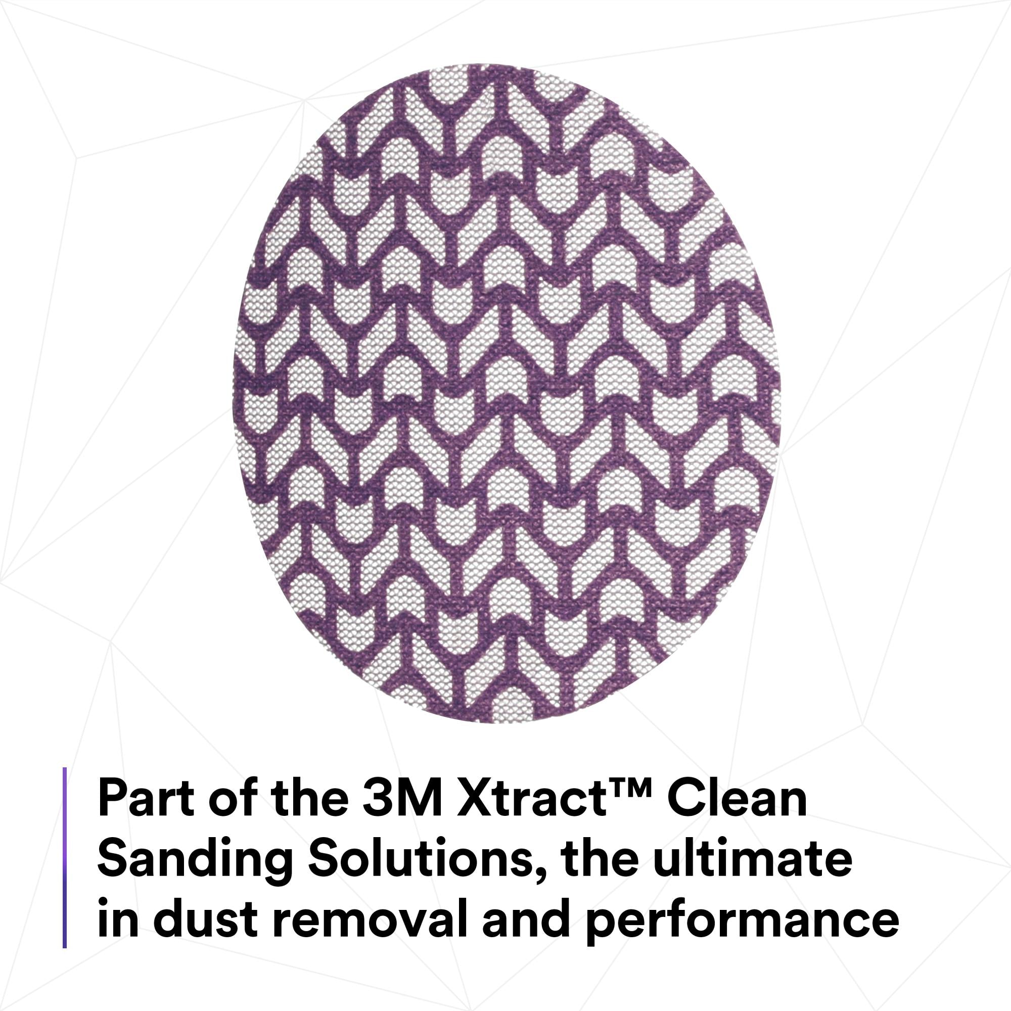 3M Xtract™ Cubitron™ II Net Disc 710W extracts up to 99% of dust produced during sanding and creating a cleaner, virtually dust-free work environment. Plus, the 3M Precision-Shaped Grain in the disc cuts with less pressure required by the operator, making for more comfortable sanding.