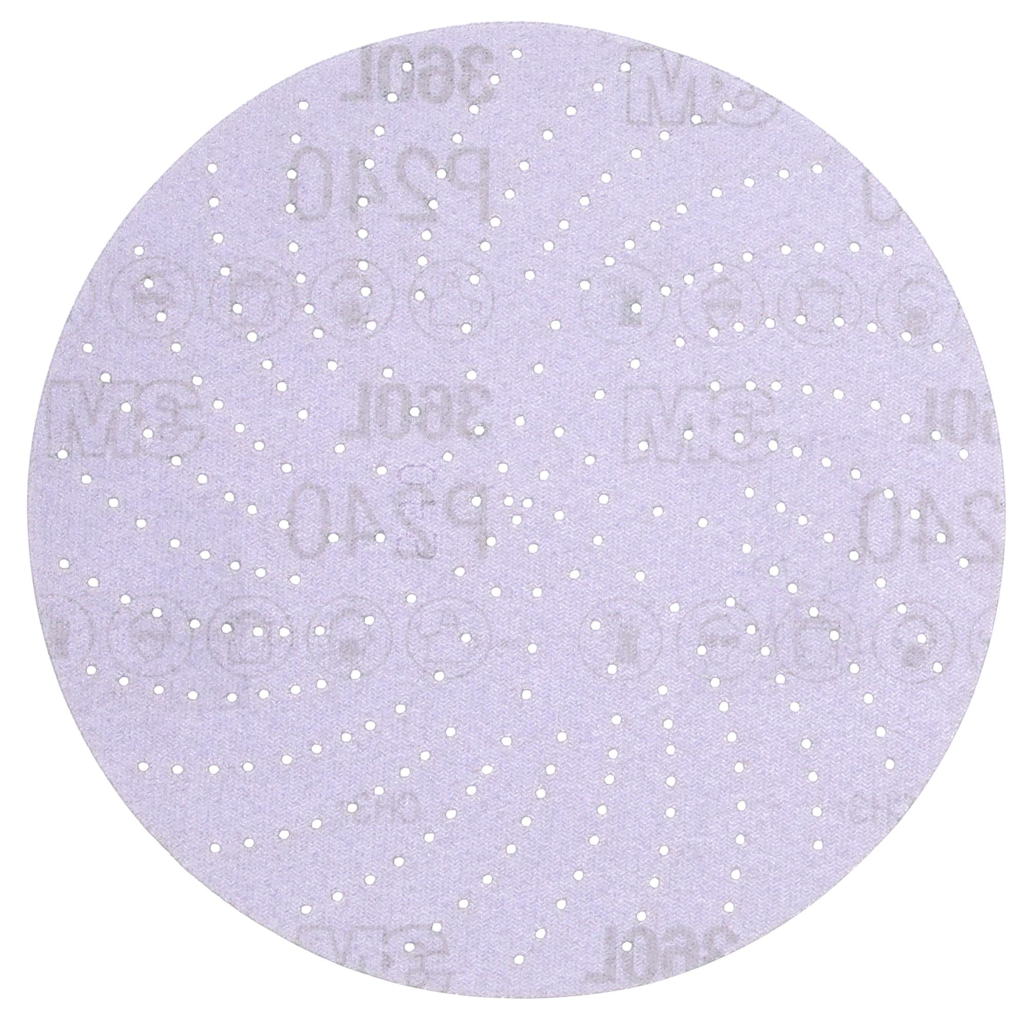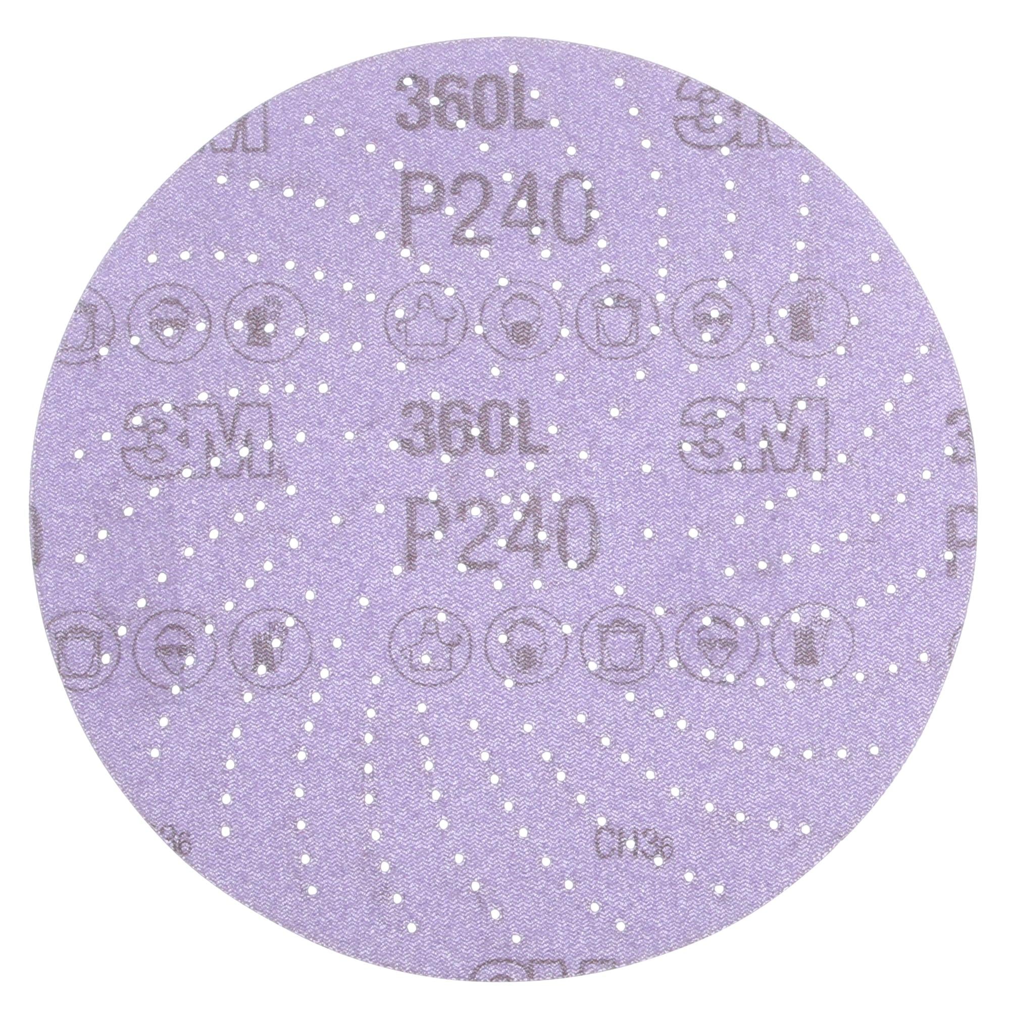 3M Xtract Film Disc 360L offers the latest innovation in dust evacuation. Multi-hole patterns evacuate dust better than 5- or 6-hole productssignificantly increasing cut-rate and disc life. The new design does not need to align with the disc pad holes, making switching the discs fast, easy, and convenient.Open-Coat Construction Minimizes LoadingSandpaper discs cut better and last longer when dust isn't loading the cutting surface of the abrasives. Reducing dust is easier than ever with 3M Xtract™ sanding discs. An open coat means the abrasive grains have space between them so that sanding debris collects in the spaces rather than loading the cutting edge of the grains. The load resistant coating allows the disc to continue cutting even when sanding softwoods, paints, and other materials that would, otherwise, clog the disc and hinder sanding ability. Meanwhile, the innovative multi-hole pattern extracts dust better than 5- or 6-hole products — increasing cut and dramatically increasing disc life.