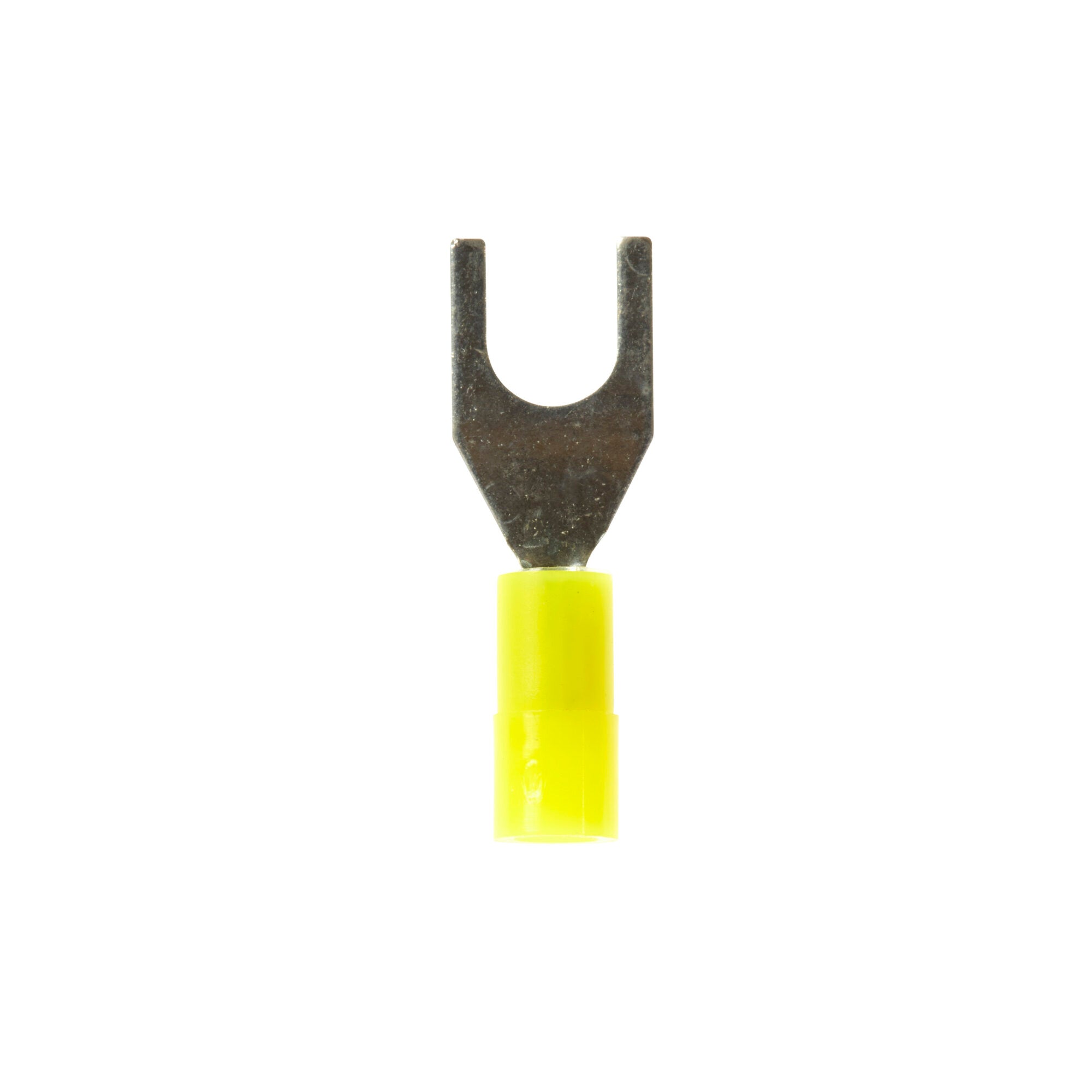 3M Standard Fork Terminal has a wider tongue for use on free-standing studs. The terminal has a nylon-insulated, brazed-seam barrel and withstands temperatures of -40 to 221 degrees F (-40 to 105 degrees C). Electrolytic copper construction offers good conductivity and a tin-plated finish resists corrosion.3M™ Standard Fork Terminal is color-coded for quick and easy identification of the wire size required. The funnel-designed, seamless sleeve guides the wire into position while providing electrical contacts and mechanical stress relief at the point of insulation. The abrasion-resistant, flared, nylon-sleeve insulation ensures positive grip and has a stepped design for mistake-proof crimping. RoHS 2011/65/EU Compliant.