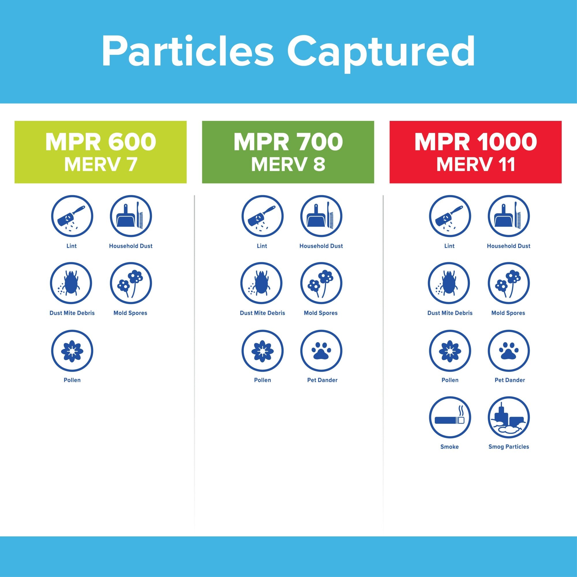 • The higher the MPR, the more microparticles - such as pollen, pet dander and smoke - your filter will capture from the air passing through it