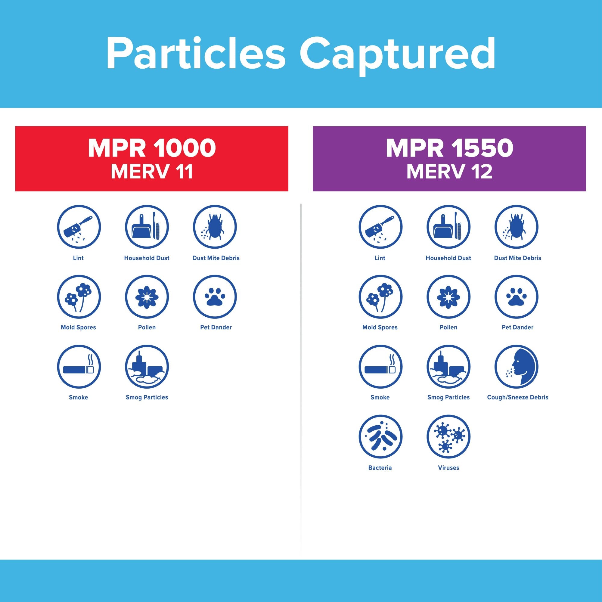 • The higher the MPR, the more microparticles--such as pollen, pet dander, smoke, bacteria and viruses--your filter will capture from the air passing through it