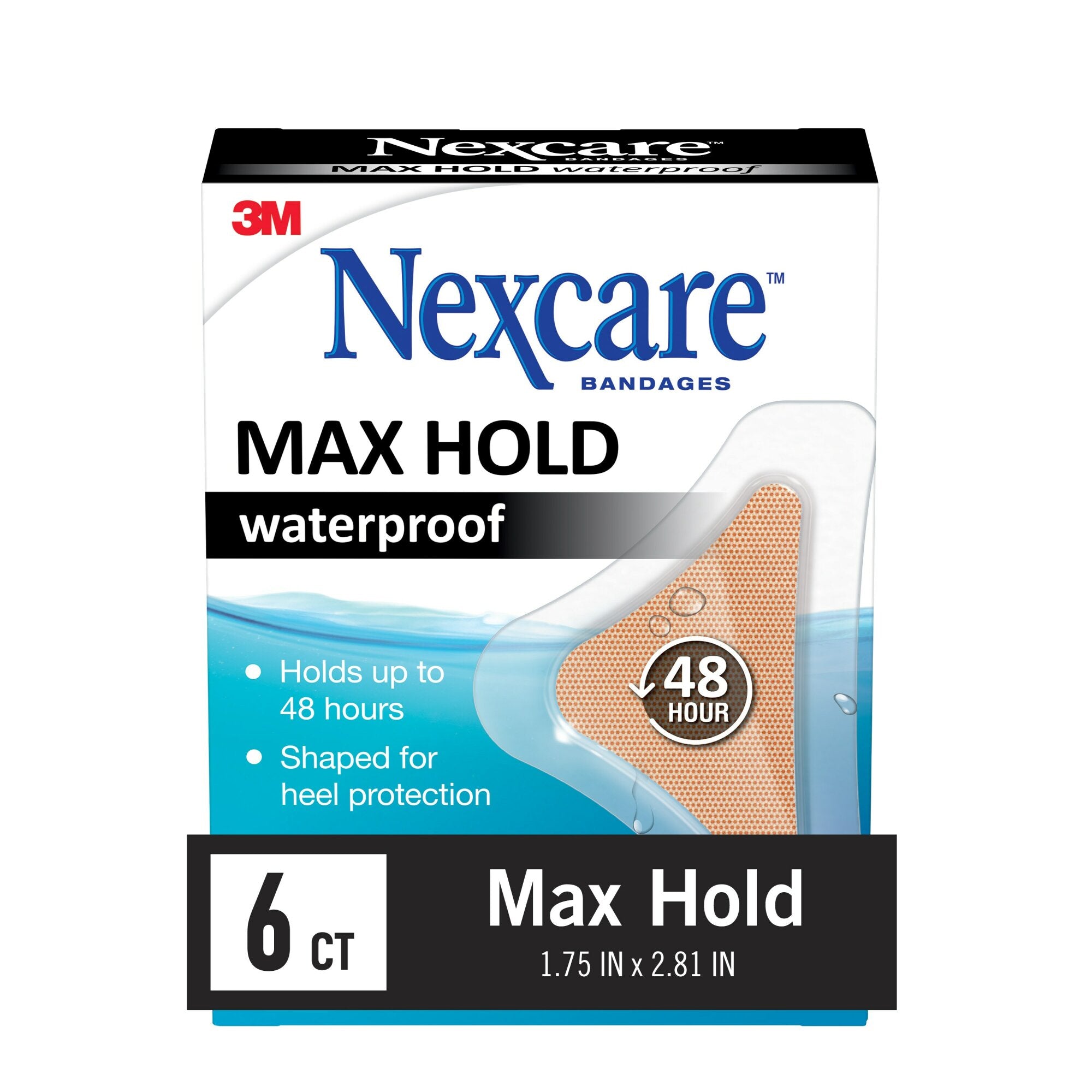 Nexcare Max-Hold Heel/Hand Waterproof Bandages MHWH-06, 1.75 in x 2.81 in (44 mm x 71 mm)Don’t let a cut, scrape, or blister slow you down. Live your life to the max with Nexcare™ Max Hold Waterproof Bandages. Ready for any adventure, the bandages hold securely for up to 48 hours even while you’re hiking, skateboarding or rock climbing. Tough but discreet, Max Hold Bandages flex, contour, and seal out water, dirt, and germs with every move. Featuring a protective center surrounded by durable film, these first aid bandages stay on for up to 48 hours. Keep going strong with Nexcare™ Max Hold Waterproof Bandages, a tough addition to your first aid kit.
