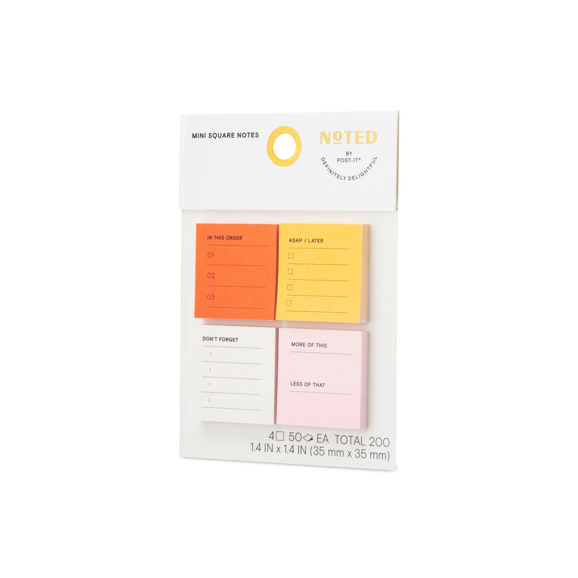 Noted by Post-it, Mini To-Do Notes, 1.4 in. x 1.4 in.Meet Noted by Post-it®, a collection of delightfully designed desktop accessories to help inspire, wrangle and commemorate life’s most notable moments. These mini To-do Notes 1.4 in. x 1.4 in. are great to help you write down those tasks and get them done. In orange, yellow, white and pink, each pad has a pre-printed heading for to-dos including, "In this order", "ASAP /later", "Don't forget" and "More of this/less of that". Stick each note in a place you will see it and check it off as you go. Featuring a unique adhesive designed to work on paper, these notes are great for use in planners or on calendars. 4 Pads/Pack, 50 Sheets/Pad. Post-it® Notes are recyclable.