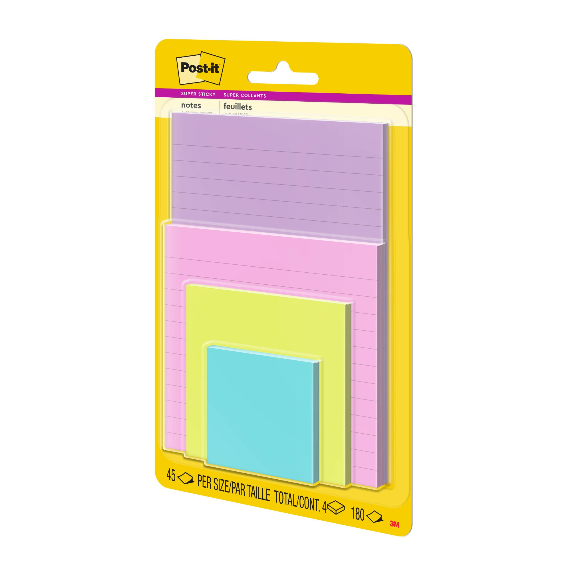 Post-it Super Sticky Notes feature 2X the sticking power. With these notes you can stick and re-stick to move reminders and to-dos with you throughout the day.Ideas are out of this world with the electric colors of the Post-it Super Sticky Notes Supernova Neons Collection. Whether jotting down your daily to-do's, brainstorming big ideas, studying or setting reminders, colors and ideas are always brighter together. These sticky notes feature 2X the sticking power. They also stick and re-stick - allowing you to move your notes with you throughout your day. They’re ideal for walls, doors, windows and other vertical surfaces, and like all Post-it Notes, they stick securely yet remove cleanly without damage. Keep your ideas across your notebooks, classroom books, calendars or other documents. No tape or tacks are needed with adhesive notes, saving you money and time on office products or school supplies. A great memo pad, these are ideal for using for notes or reminders to yourself or others. Post-it Super Sticky Notes are the perfect solution for shopping lists, reminders, notes on computer screens, time tracking, to-do lists, marking cables, color-coding documents, reminding kids to do chores, storyboarding, scratch paper and agile processing. This pack includes 1 pad of 4 in. x 6 in. notes, 1 pad of 4 in. x 4 in. notes, 1 pad of 3 in. x 3 in. notes and 1 pad of 1 7/8 in. x 1 7/8 in. notes. All pads are 45 sheets. These colorful sticky notes include colors from the Supernova Neons collection including pink, lime, lilac and aqua. All Post-it Notes are sourced from certified, renewable and responsibly managed forests, and all Post-it Notes are recyclable, so you can recycle them when they are no longer needed.
