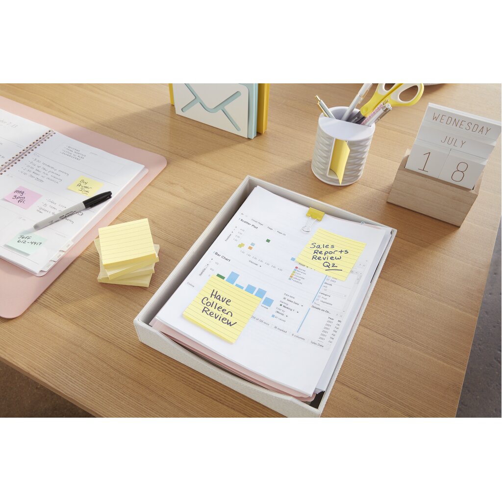 Need help getting the message straight? Stock up on these Post-it Notes with lines! Convenient two-pack includes 100-sheet pads of 3x3 inch notes in Canary Yellow -- our most popular size and original color for everyday messages.Post-it® Notes stick securely and remove cleanly, featuring a unique adhesive designed for use on paper. 3 in. x 3 in. size is great to call out important information or leave notes in calendars or planners. Lined notes are great for short lists. Canary Yellow color helps your note break through. Post-it® Notes are recyclable, and the paper is sourced from certified, renewable and responsibly managed forests. 100 Sheets/Pad, 2 Pads/Pack.