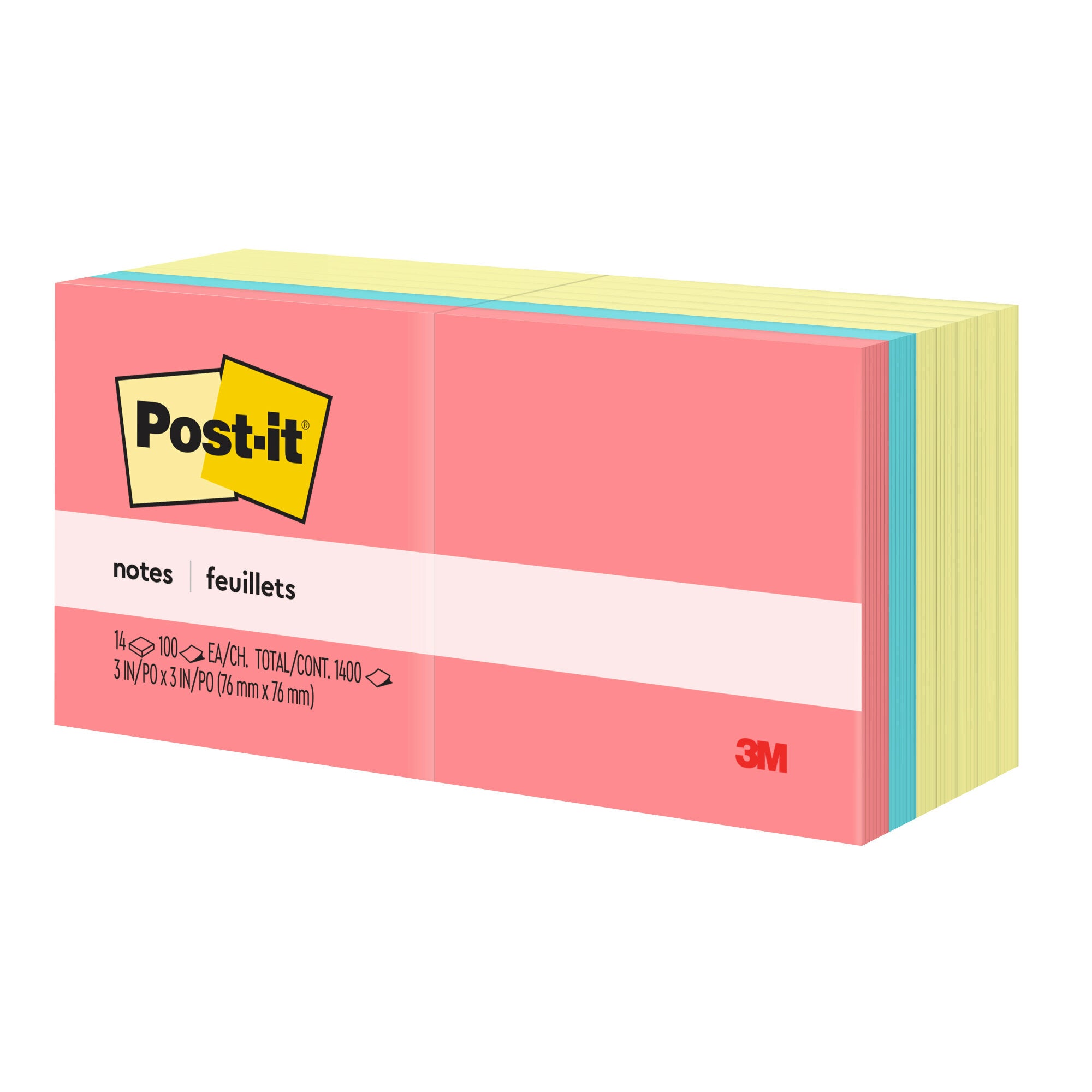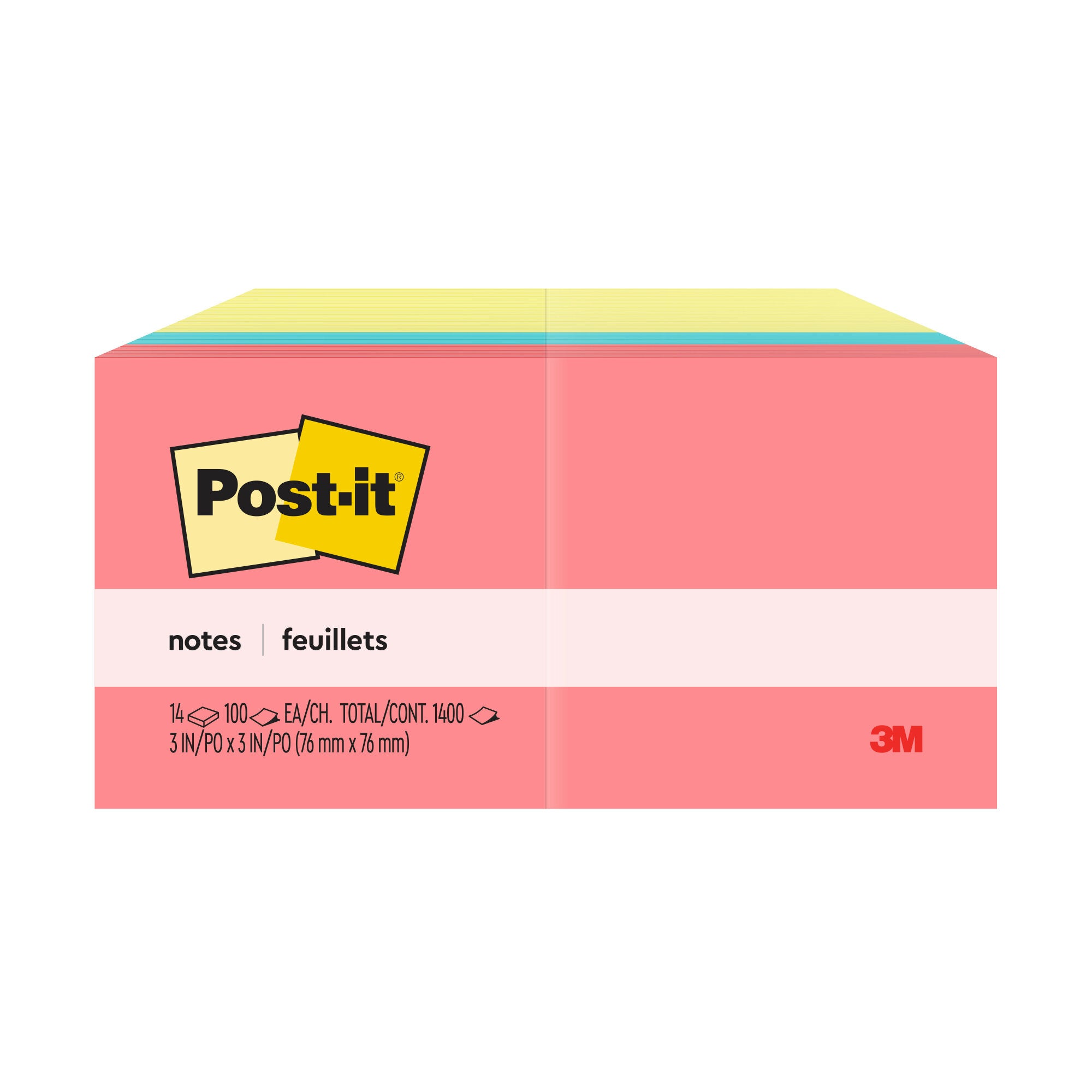 Post-it Notes stick securely and remove cleanly, featuring a unique adhesive designed for use on paper.Post-it® Notes stick securely and remove cleanly, featuring a unique adhesive designed for use on paper. America's #1 favorite sticky note, the 3 in. x 3 in. size is great to call out important information or leave notes in calendars or planners. Canary Yellow color helps your note break through. Post-it® Notes are recyclable, and the paper in Post-it® Notes is sourced from certified, renewable and responsibly managed forests. 14 Pads/Pack with 4 free Pads in Poptimistic collection colors and the rest in classic Canary Yellow. 100 Sheets/Pad.