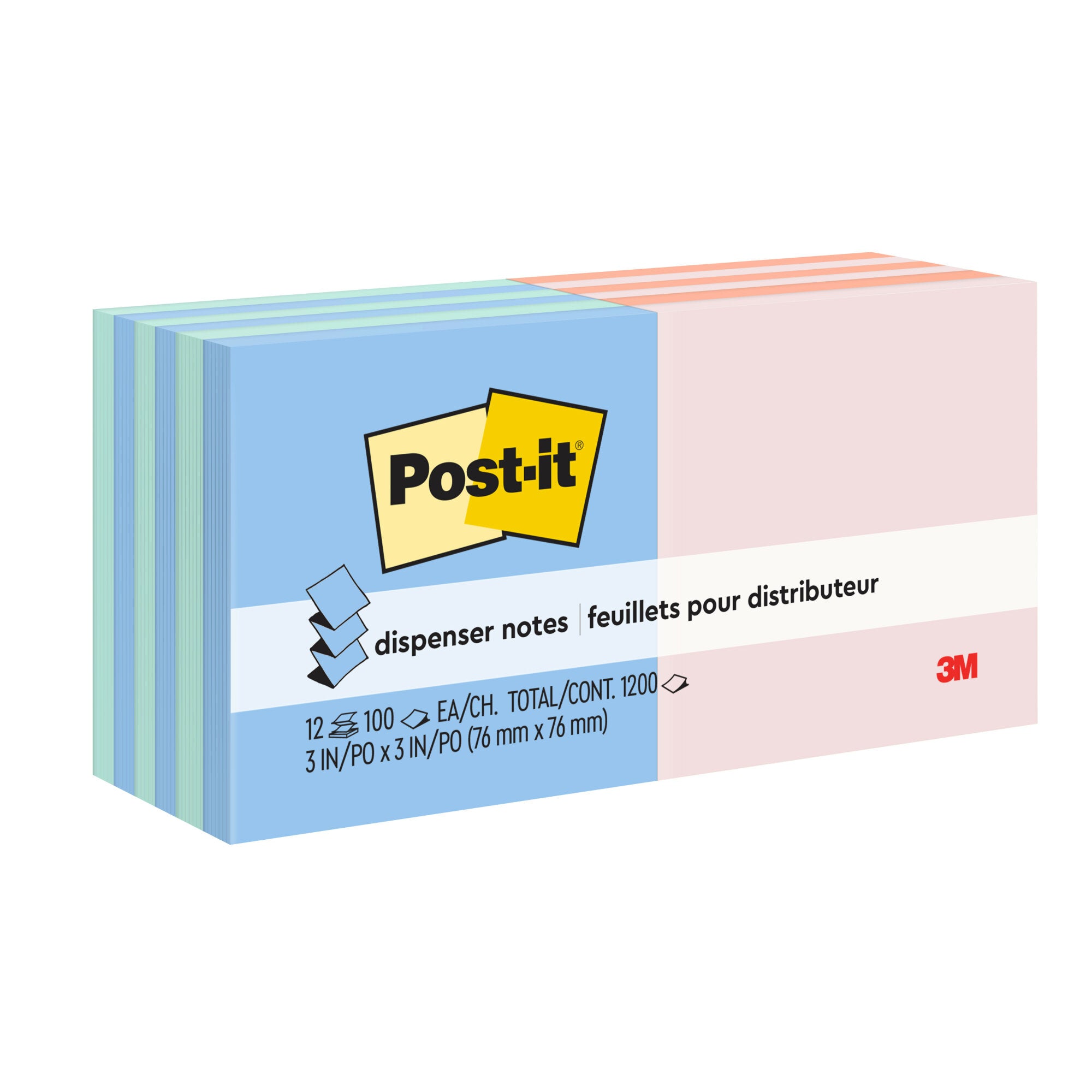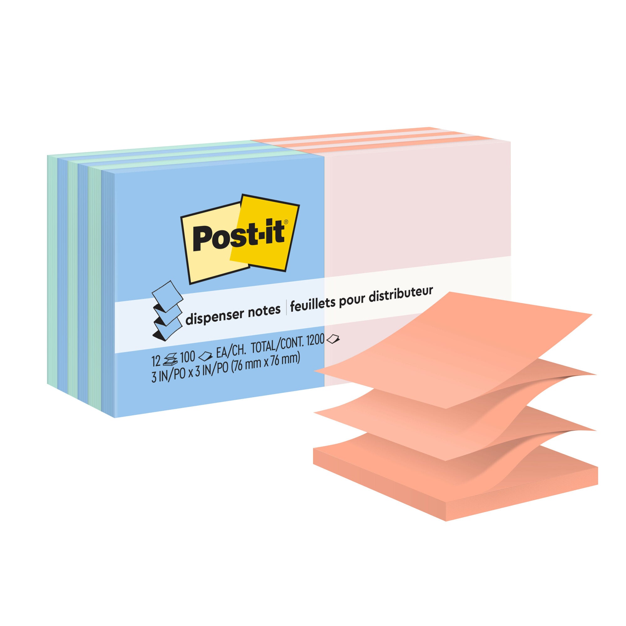 Post-it Dispenser Notes, 3 in. x 3 in., are accordion-style notes specially designed to work in Post-it Note Dispensers.Post-it® Dispenser Notes, 3 in. x 3 in., are accordion-style notes specially designed to work in Post-it® Note Dispensers. With these notes, you'll always have a note nearby to capture great ideas. Unique adhesive is designed to work on paper or in planners. Use for notes or reminders to yourself or others. Pads are in two sets of alternating colors - 6 pads alternate between Fresh Mint and Canary Yellow, while the other 6 pads alternate with Pink Salt and Papaya Fizz. Post-it® Dispenser Notes are recyclable and the paper in Post-it® Notes is sourced from certified, renewable and responsibly managed forests. 12 Pads/Pack, 100 Sheets/Pad.
