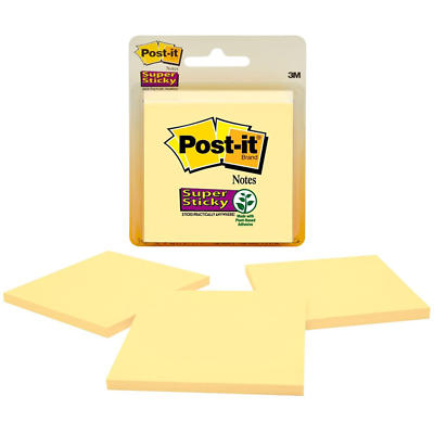 Post-it® Super Sticky Notes in 2 in x 2 in feature 2x the sticking power. Use for short notes or reminders on doors, windows or walls. Unique adhesive reliably sticks and re-sticks so your message can stay front and center. Move your notes with you throughout the day. Classic Canary Yellow color helps your note break through. 3 Pads/Pack, 45 Sheets/Pad.