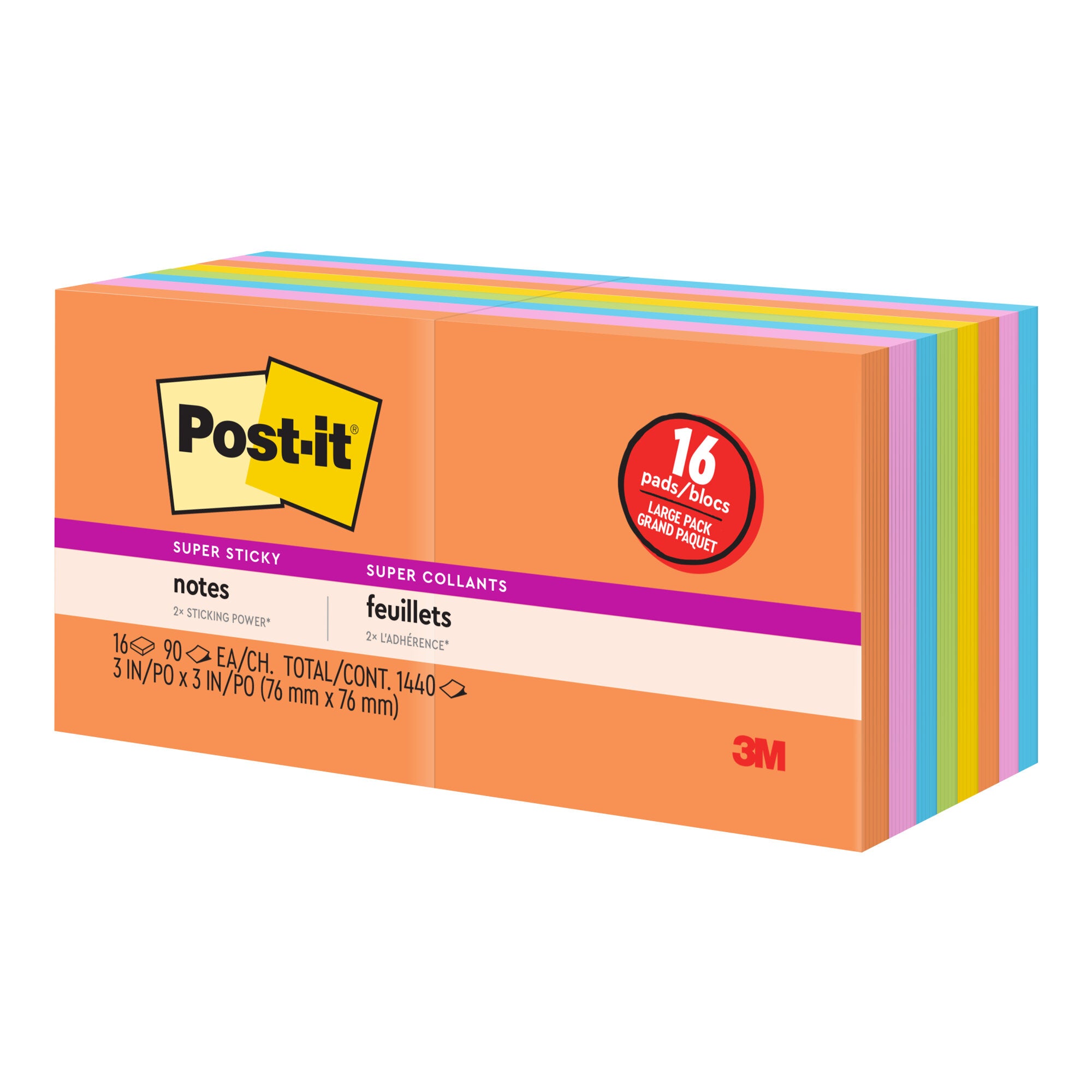 Post-it Super Sticky Notes feature 2X the sticking power. With these notes you can stick and re-stick to move reminders and to-dos with you throughout the day.Uplift your spirits and messages via the vibrant, strong colors of the Energy Boost collection. Whether jotting down your daily to-do's, brainstorming big ideas, studying or setting reminders, colors and ideas are always brighter together. These sticky notes feature 2X the sticking power. They also stick and re-stick - allowing you to move your notes with you throughout your day. They’re ideal for walls, doors, windows and other vertical surfaces, and like all Post-it Notes, they stick securely yet remove cleanly without damage. Keep your ideas across your notebooks, classroom books, calendars or other documents. No tape or tacks are needed with adhesive notes, saving you money and time on office products or school supplies. A great memo pad, these are ideal for using for notes or reminders to yourself or others. Post-it Super Sticky Notes are the perfect solution for shopping lists, reminders, notes on computer screens, time tracking, to-do lists, marking cables, color-coding documents, reminding kids to do chores, storyboarding, scratch paper and agile processing. Each notes sheet is approximately 3 in. x 3 in., with 90 sheets per pad and 16 sticky note pads per pack. These colorful sticky notes include colors from the Energy Boost collection including orange, pink, yellow, blue and green. All Post-it Notes are sourced from certified, renewable and responsibly managed forests, and all Post-it Notes are recyclable, so you can recycle them when they are no longer needed.