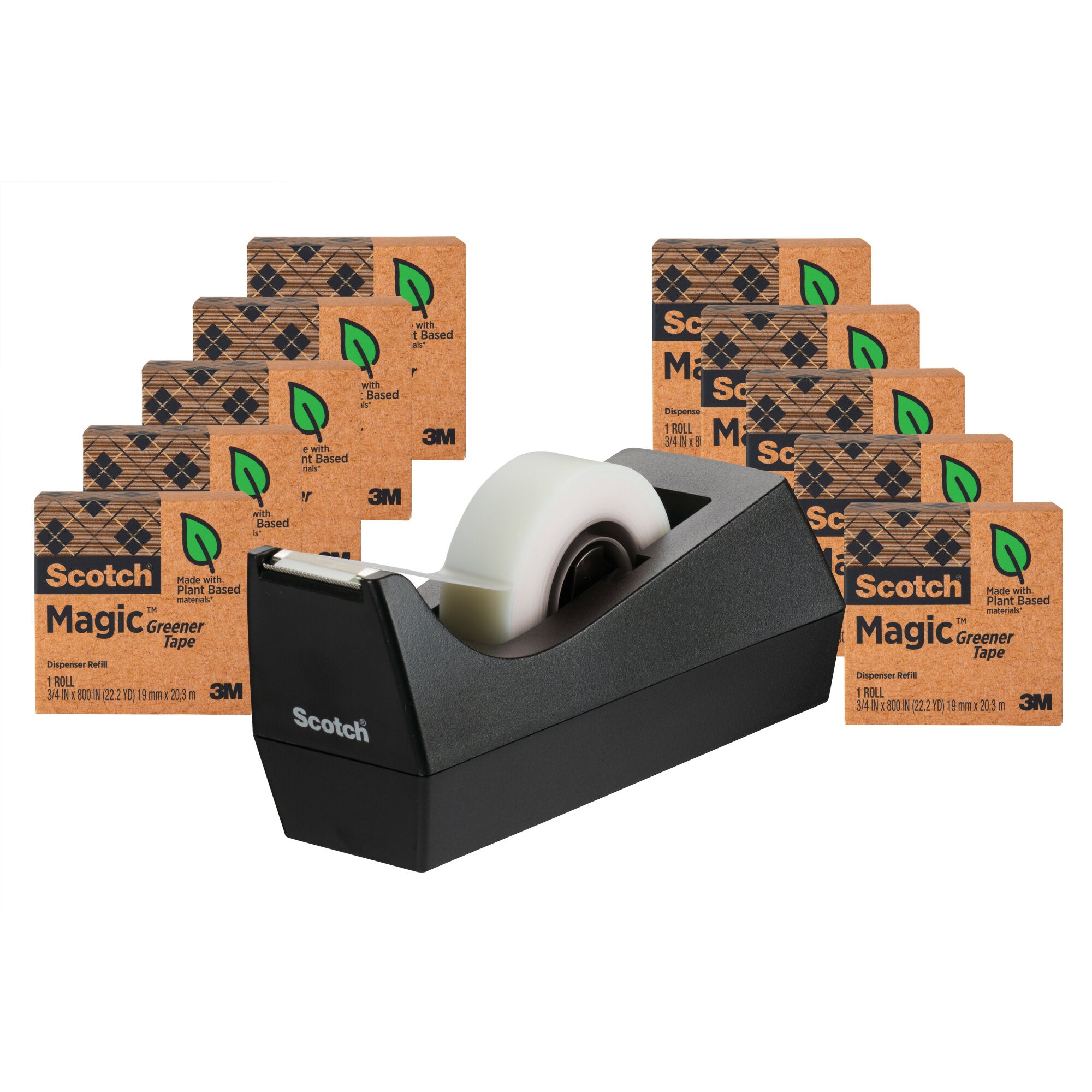 Scotch Magic Greener Tape is a more environmentally friendly version of the original matte-finish, invisible tape, with the same great performance. Free dispenser included!When important documents and school projects need mending and you also want to help the environment it's Scotch® Magic™ Greener Tape for the many rips and tears you have around the house. Scotch® Magic™ Greener Tape has all the strength of our Magic™ Tape. All the holding power of Magic™ Tape. Disappears just like our tried and true Magic™ Tape. But because Magic™ Greener Tape is made from over 65% recycled or plant-based material, it's the more eco conscious choice. It comes with the easy to use Scotch® Tape Dispenser, so the tape glides off smoothly, cuts evenly, with no waste. Works like magic because it's just like Magic™ Tape. Only Greener.