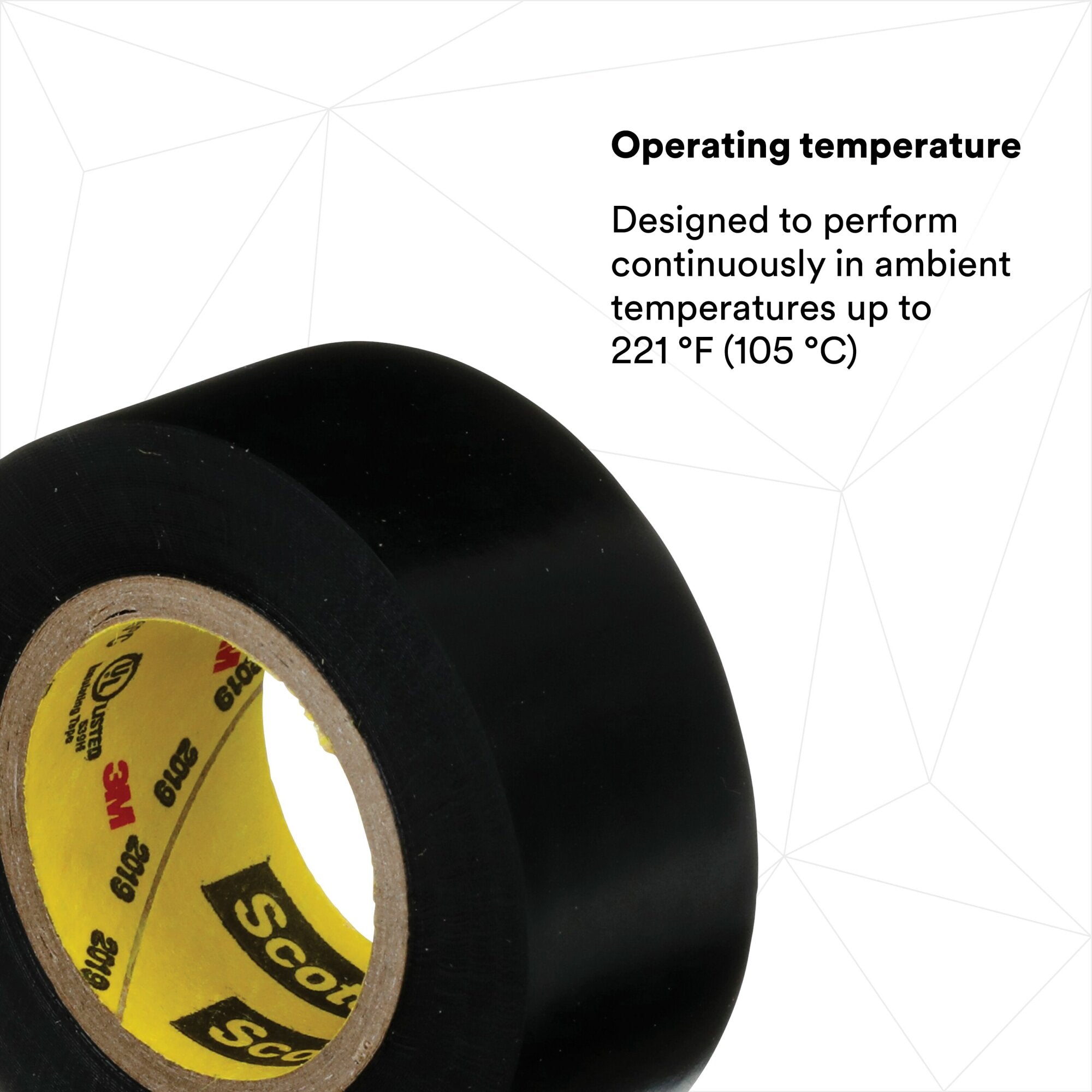 Scotch Super 33+ Vinyl Electrical Tape is a 7 mil thick, premium grade tape that provides electrical insulation for all wires and cables rated up to 600V. The flame retardant tape withstands a temperature range of 0 to 221 F ( 18 to 105 C). It is compatible with solid dielectric cable insulation, synthetic cable insulations, jackets and splicing compounds.Scotch® Super 33+ Tape is designed for above/below grade, indoor/outdoor, low and high voltage applications and for harnessing cables. This tape offers electrical and mechanical protection with the combination of a pressure sensitive, rubber resin adhesive and elastic, PVC backing. It provides a protective jacket for high voltage cable splices. This electrical tape is highly resistant to UV rays, abrasion, moisture, alkalis, solvents and many acids. UL Listed, CSA Certified and RoHS 2011/65/EU Compliant.