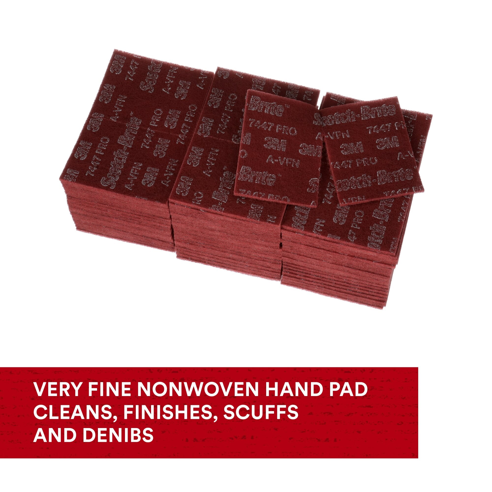 Scotch-Brite 7447 Pro Hand Pad combines flexibility with effective cutting action and precise hand control to help you accomplish tough cleaning jobs or produce fine finishing results, use after use. The tightly graded abrasive particles in this new pad provide a consistent, uniform scratch throughout life of the hand pad.Our very fine grade aluminum oxide abrasives cut fast and fine, leaving a smooth, finished surface. Suitable for use on a wide variety of materials such as wood, metal, plastics, ceramics, porcelain, glass, rubber, or composites, and for many different tasks, the performance of this pad is comparable to steel wool grade 0. However, unlike steel wool, Scotch-Brite™ 7447 Pro Hand Pads won’t rust after use, or create fine metal splinters. The non-woven, open-web material resists loading and can be used dry, with water, or some solvents. You can use this multipurpose 6 x 9 inch pad by hand for precise control, with a hand pad block for uniform finishing, or on an in-line sander to cover large areas.