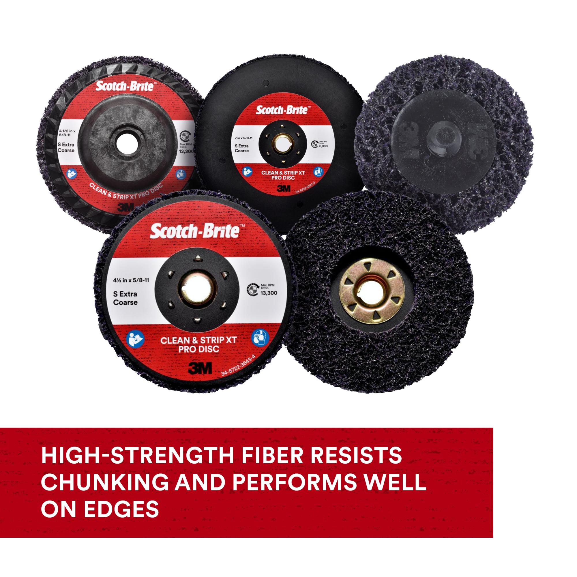 Scotch-Brite Clean and Strip XT Pro Disc features silicon carbide abrasive mineral incorporated into an open nylon web. It effectively removes rust, paint, mill scale, coatings and adhesives from surfaces without significantly altering the base material. The high-strength fibers are highly conformable, resist chunking and loading, and perform well on the edges of a workpiece.Take Advantage of High Conformability