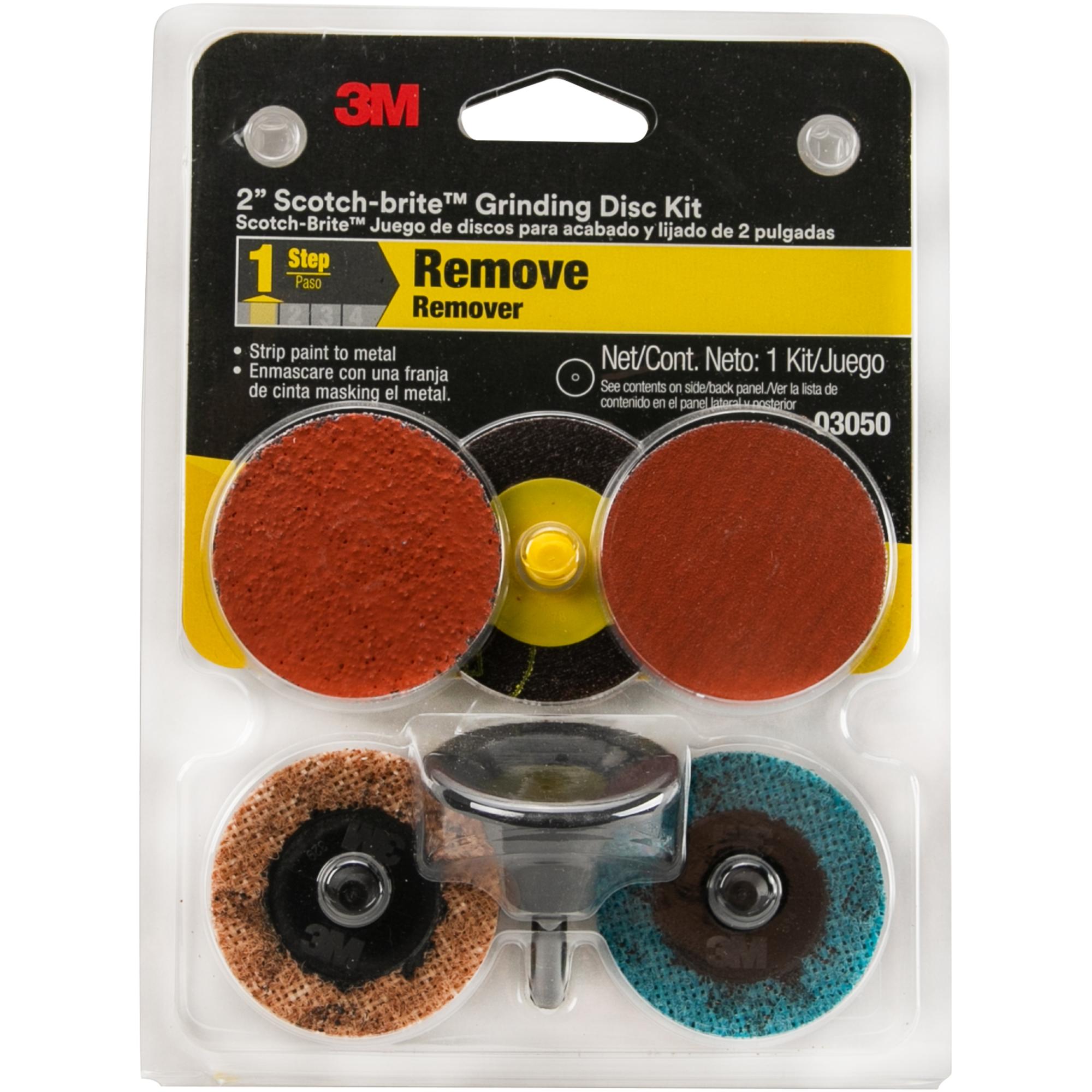 The Scotch-Brite Grinding Disc Kit lets you use tough industrial grade abrasives for auto repairs in any garage. It contains five 2 dia. discs, color-coded in 3 grits, and a Roloc adaptor allows you to quickly attach them with a simple twisting motion to a household drill. The kit is great for stripping paint and primer to metal, removing rust and gasket material, metal polishing and more.Our Scotch-Brite™ Grinding Disc Kit lets you use tough industrial grade abrasives for auto repairs in any garage. It contains five 2” dia. discs, color-coded in 3 grits, and a 3M™ Roloc™ adaptor allows you to quickly attach them with a simple twisting motion to a household drill. The kit is great for stripping paint and primer to metal, removing rust and gasket material, metal polishing and more.