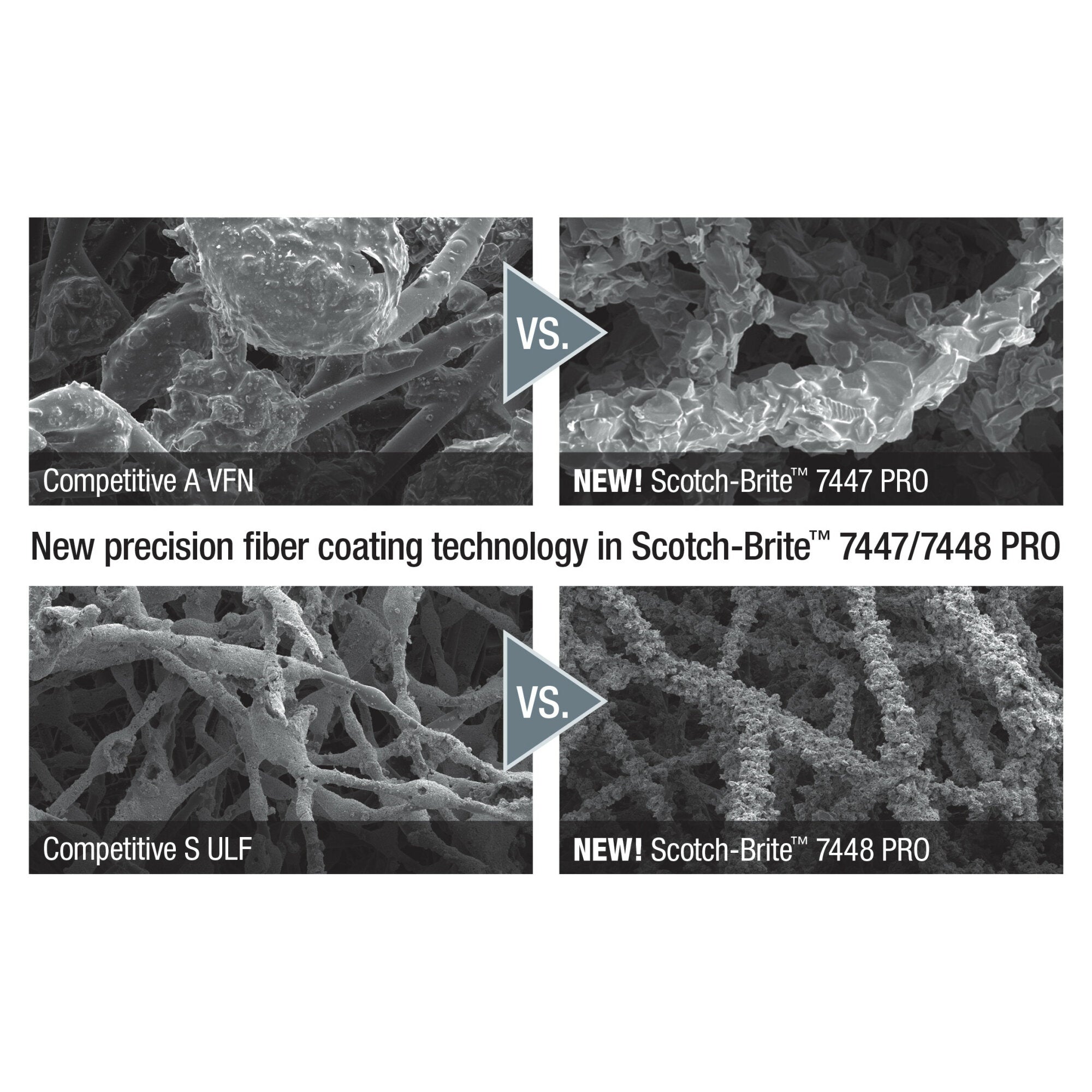 Scotch-Brite™ Pro Discs are unique surface conditioning products that feature mineral coated on non-woven nylon fibers. Breakthrough fiber coating technology allows Scotch-Brite™ Pro abrasive products to cut faster and produce a consistent scratch, reducing the time and effort it takes to finish parts. Combining mineral with the fibers creates an abrasive system that delivers consistent results for the life of the product. The open-web material is load resistant and keeps abrasive minerals cutting at high performance by limiting clogging of the nylon fibers. These discs are commonly used for tough cleaning, scuffing and finishing jobs.