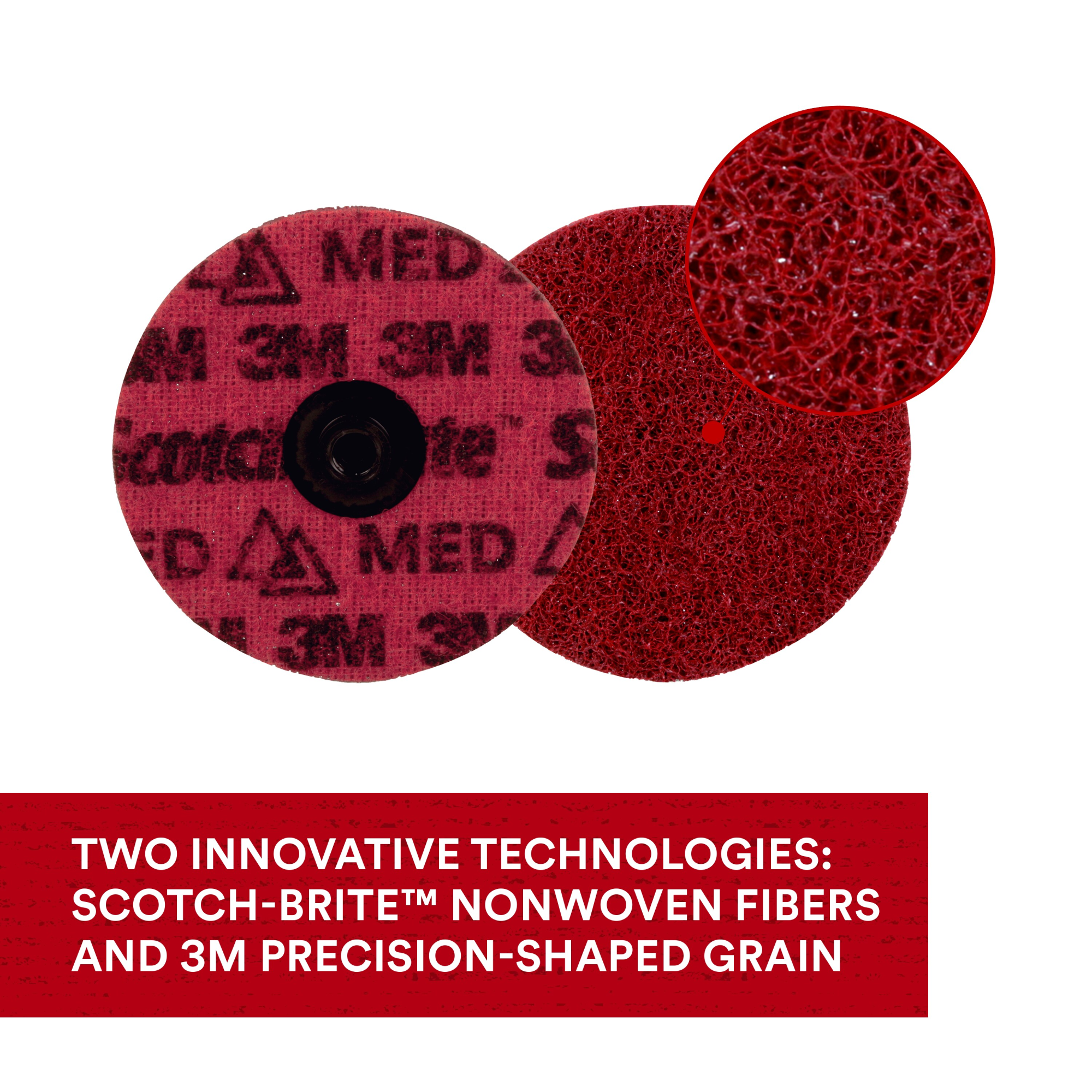 • TWO INNOVATIVE TECHNOLOGIES IN ONE DISC: Scotch-Brite™ nonwoven fibers combined with 3M Precision-Shaped Grain deliver improved performance over traditional surface conditioning discs