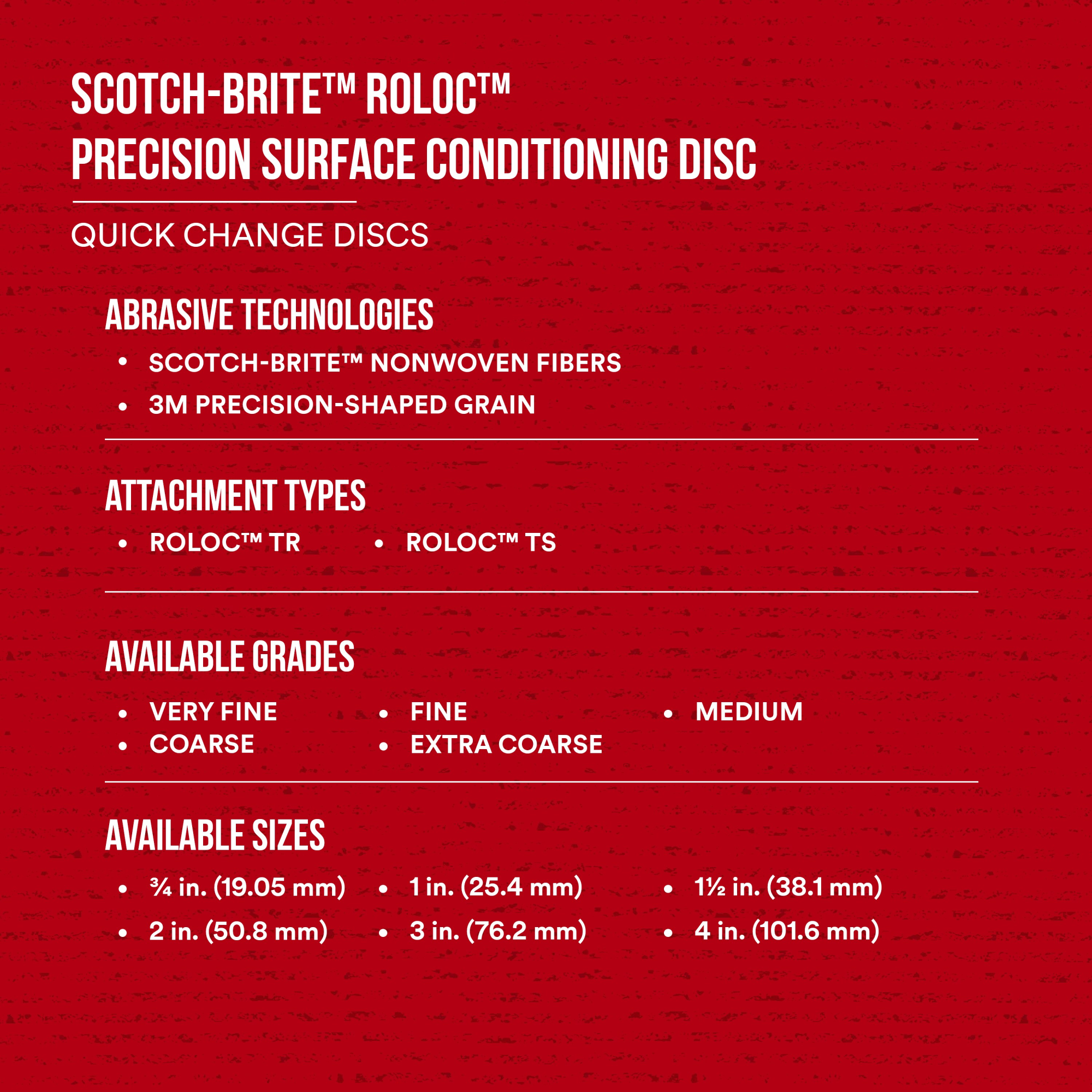 Scotch-Brite Roloc Precision Surface Conditioning Discs set a new standard in surface conditioning performance. These reformulated general-purpose discs feature 3M Precision-Shaped Grain technology incorporated into the nonwoven web, bringing a new level of productivity and abrasive life to the Scotch-Brite lineup.Redesigned with you in mind. Meet the next advancement in surface conditioning technologies: Scotch-Brite™ Roloc™ Precision Surface Conditioning Discs. This new addition to the Scotch-Brite™ lineup promises the consistency you’ve come to expect with increased cutting speed and longer abrasive life. By combining two flagship 3M technologies — nonwoven fibre and ceramic 3M Precision-Shaped Grain — you can get the ideal finish, faster. To help you be even more efficient, these discs come in brighter, more vivid colors to make identification easier. Plus, the grade range has been expanded to include Fine and Extra Coarse offerings, providing an even larger range of solutions for your abrasive needs. Ready to improve your process. These premium general-purpose discs are designed to streamline surface conditioning processes including cleaning, blending, deburring and finishing. Typical substrates include aluminum and soft metals, carbon steel and stainless steel, with applications ranging from coating and corrosion removal to refining and post-cast processing. Applications Coating removal Corrosion removal Refining coated abrasive scratches Refining machine marks Post-cast processing Burr removal Removing micro-burrs