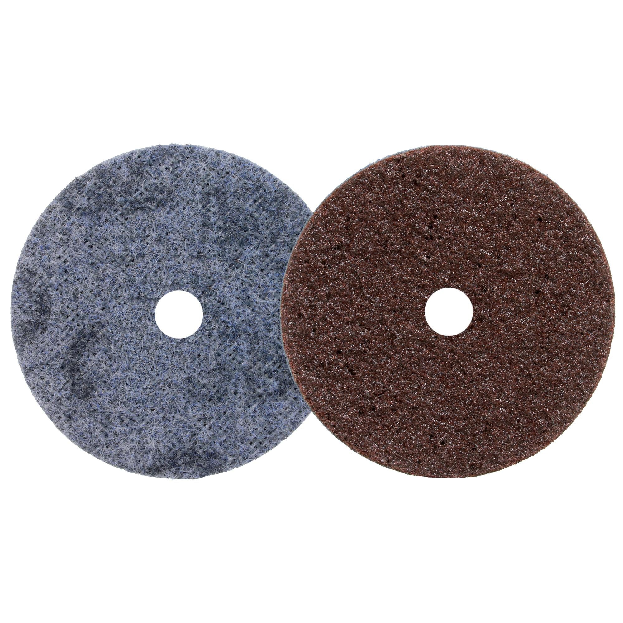 Scotch-Brite SE Surface Conditioning Disc combines an aggressive, non-woven disc to perform heavy-duty deburring and finishing with the efficiency of a hook and loop attachment system. Its heavy-duty non-woven fiber construction conforms well to help preserve edges as well as irregular or contoured surfaces.