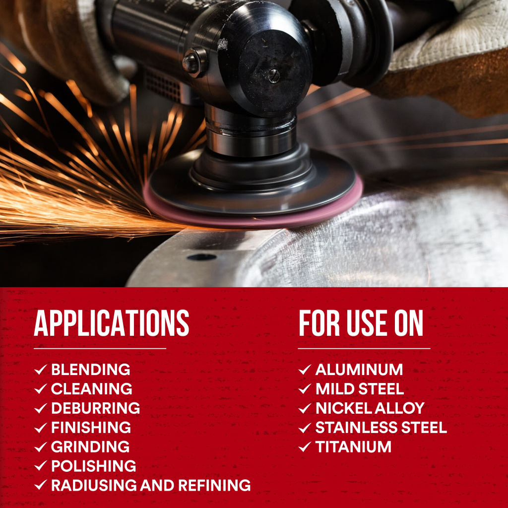 Scotch-Brite™ surface conditioning products were developed with abrasives incorporated into nonwoven nylon or synthetic fibers. Combining abrasives with the fibers creates an abrasive system that delivers consistent results for the life of the product. The open-web material runs cool, reducing the risk of part discoloration and warping. The fibers are load resistant and keep the abrasive minerals cutting at high performance by limiting clogging of the fibers, which also extends the life of the disc.