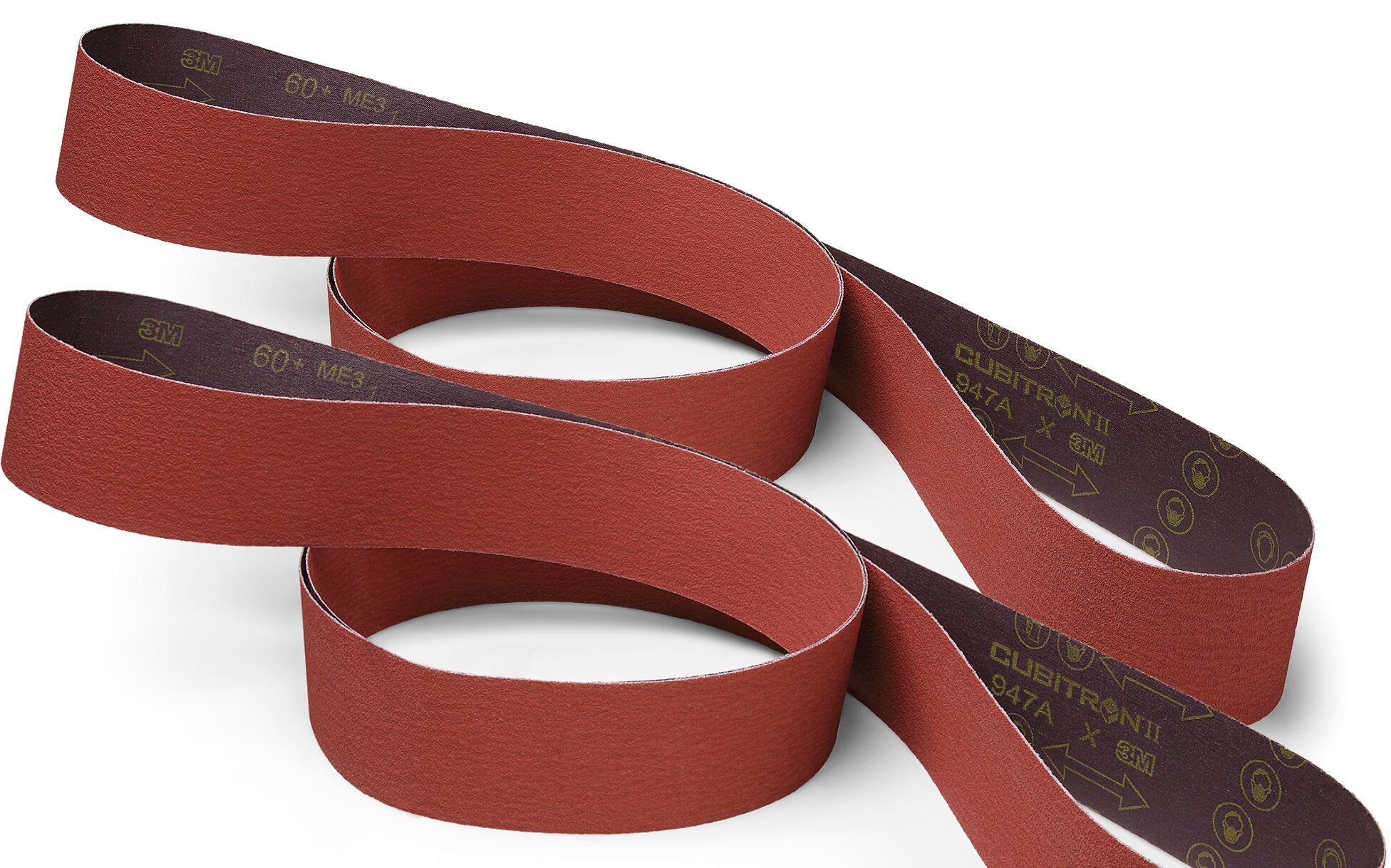 A semi flexible Cubitron II belt the 3M™ 947A sports an X-weight poly-cotton backing. Among backing weights, an X-weight cloth is flexible and provides tensile strength as well.