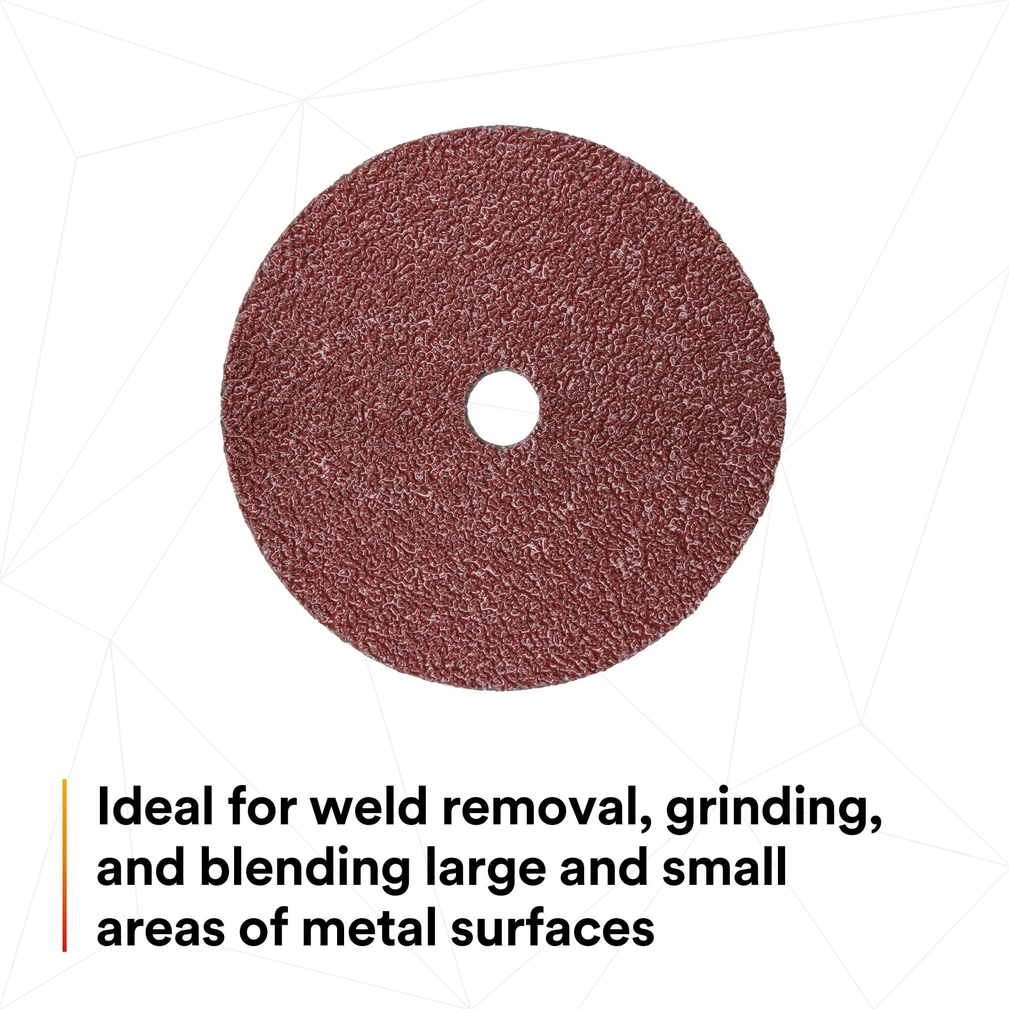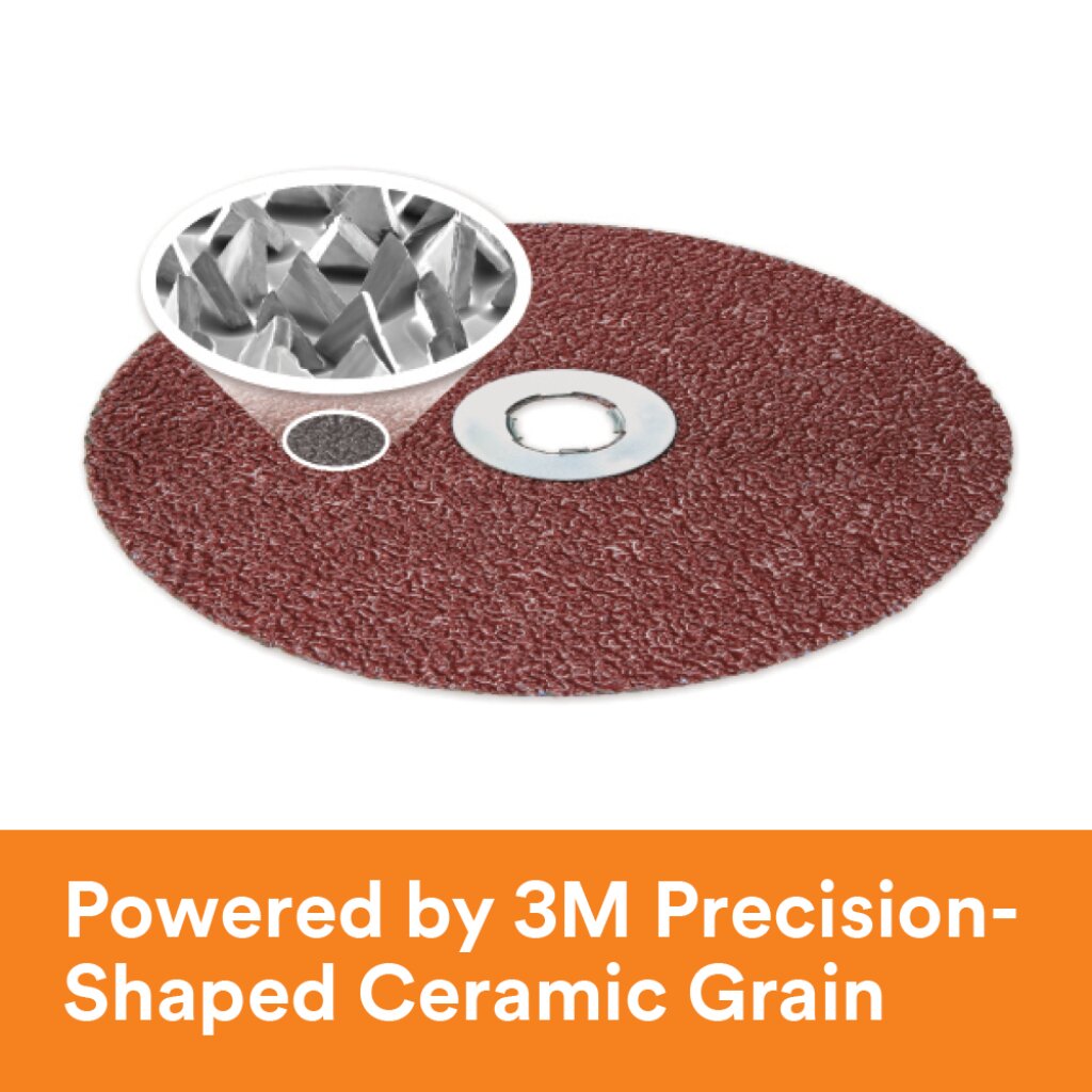 3M Cubitron II Fibre Disc 982C uses 3M Precision-Shaped Grain to generate up to twice the cut-rate, durability, and life of other fiber discs when grinding carbon steel all with less grinding pressure required by the operator. That means less operator fatigue, faster throughput, and more parts per disc when tackling medium and high-pressure grinding applications.Raising the Bar in Abrasives This premium fibre disc raises the bar in speed and stock removal. With 3M Precision-Shaped Grain, 3M engineers developed a process for generating triangular shaped ceramic grains that are electrostatically oriented on the backing to form sharp peaks and maximize cutting potential. These peaks act like individual cutting tools that slice through metal, and continuously fracture into new sharp cutting edges. The grains wear evenly and self-sharpen, reducing heat due to friction to deliver up to twice the life of other fibre discs, with less grinding pressure. The result is that 3M Cubitron™ II Fibre Disc 982C out-cuts and outlasts every conventional ceramic industrial abrasive disc on the market, maximizing productivity and helping reduce your overall abrasive spend. Ideal for Robotic Weld Grinding In medium and high-pressure applications like robotic weld grinding, it's important to choose a high-performance abrasive that cuts fast and lasts long. The self-fracturing mineral in 3M™ Cubitron™ II Fibre Disc 982C will keep your robot grinding welds long after other abrasives call it quits, reducing downtime and maximizing efficiency. Curious about robotic material removal? Our dedicated team of 3M robotics application engineers are ready to partner with you on your automation journey, from idea to implementation. Choose Your Grit 3M™ Cubitron™ II Fibre Disc 982C comes in a range of grits to suit your application needs — from coarse grinding large welds to blending and deburring. Your Total Solution Supplier Combined with 3M power tools and application engineering expertise, 3M™ Cubitron™ II Fibre Disc 982C is part of a complete abrasive solution. With the 3M abrasive solution, you’ll have the right abrasives, the right tools and industry-leading application engineers to help you take your shop to the next level.