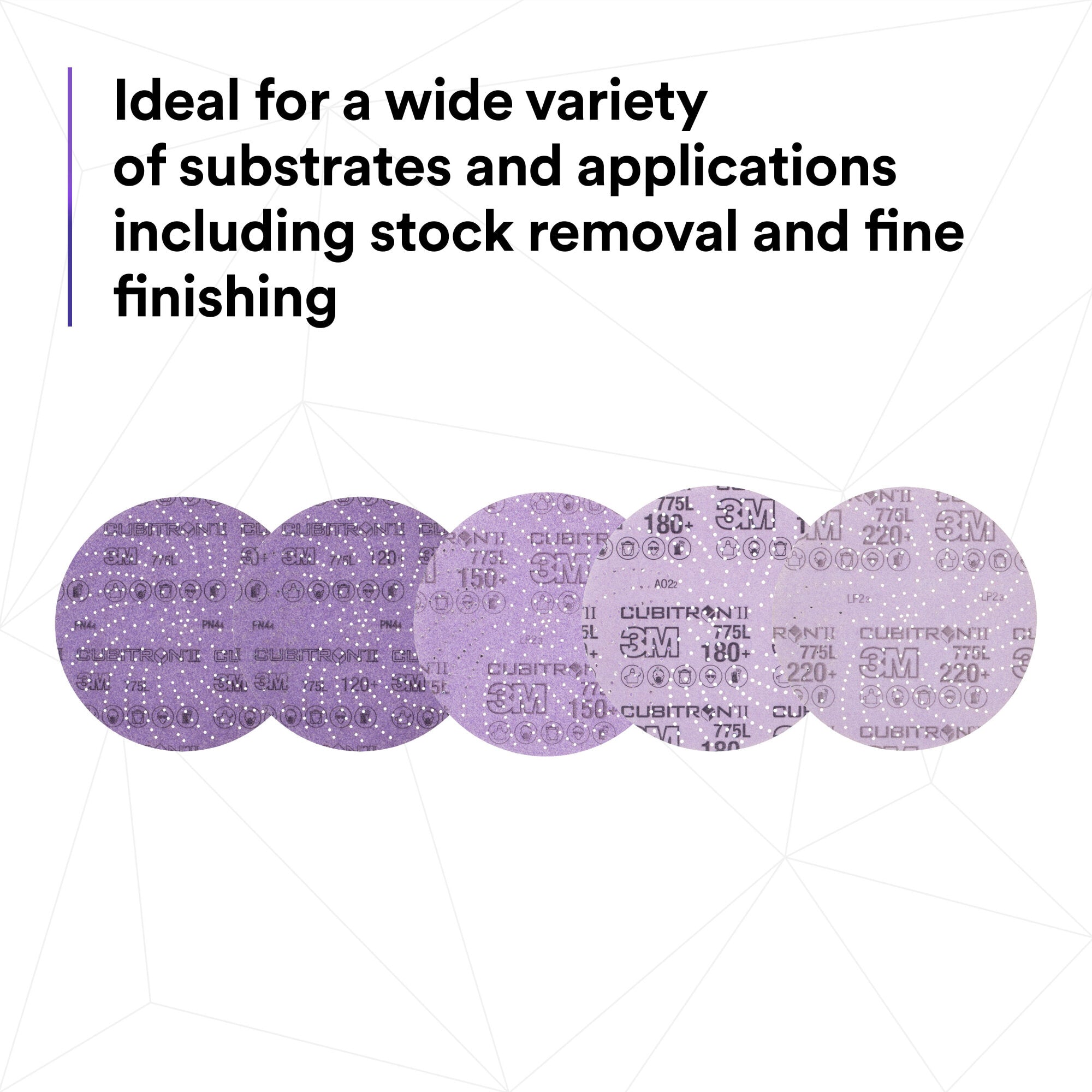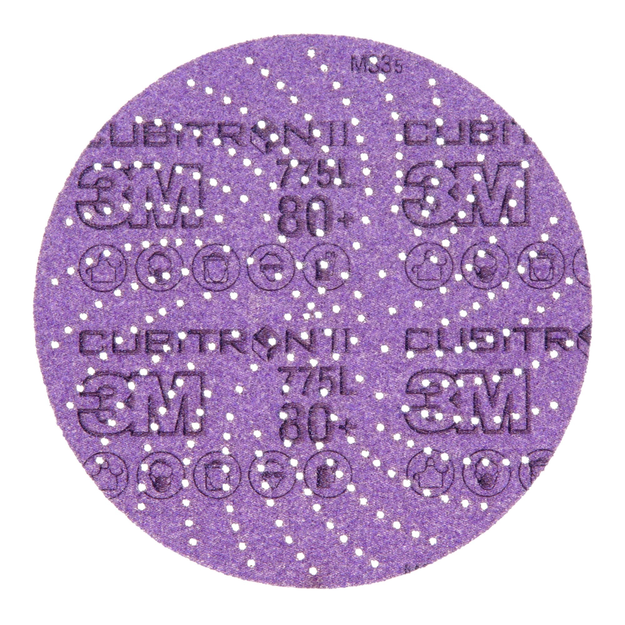 3M Xtract Cubitron II Disc 775L features a 3M proprietary multi-hole pattern for improved dust extraction in finishing applications. Part of the 3M Xtract Series, designed for optimal dust removal. An innovative multi-hole pattern extracts dust better than 5- or 6-hole products increasing cut and dramatically increasing disc life. The design does not need to align with the disc pad holes, making switching the discs fast, easy and convenient. Featuring ceramic 3M Precision-Shaped Grain, a revolutionary advancement in abrasive technology. The triangular shaped ceramic mineral is designed to slice through the substrate, rather than gouging or plowing like conventional abrasives, resulting in a disc that cuts up to 2x as fast as conventional abrasives. The film backing delivers outstanding tear resistance, flexibility and a consistent, uniform finish on a variety of substrates.These discs are ideal for a broad range of applications focused primarily on stock removal, and are effective on a wide variety of substrates, including metals, composites, gelcoat, and whitewood. The film backing offers greater tear resistance than paper discs, for additional durability and edge retention. For best results, pair with 3M Xtract™ Random Orbital Sanders. Open coat construction means the abrasive grains are placed with space between them to help evacuate dust and other sanding debris and avoid clogging the cutting edge of the grains. The load-resistant coating allows the disc to continue cutting even when sanding softwoods, paints, and other materials that would, otherwise, clog the disc and hinder sanding ability. All of this adds up to increased productivity and reduced material consumption. Sandpaper discs cut better and last longer when dust isn't loading the cutting surface of the abrasives. Our proprietary multi-hole pattern on 3M Xtract™ products removes dust at a higher rate than 5- or 6-hole products. This hole design doesn't even require alignment of holes with the disc pad, making disc changes quick and simple. For maximum dust extraction, use this disc with a 3M Xtract™ Back-up pad and a random orbital sander with vacuum (both sold separately).