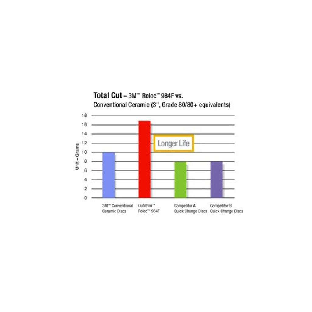 To save time and increase throughput, our 3M™ Cubitron™ II Roloc™ Durable Edge Disc 984F combines the convenience of the 3M™ Roloc™ Quick-Change Attachment System with 3M proprietary Precision-Shaped Grain (PSG) technology, delivering outstanding cut rates and disc life. For long life and durability, we used a laminated 2-ply polyester backing for wear-resistance in edge work.