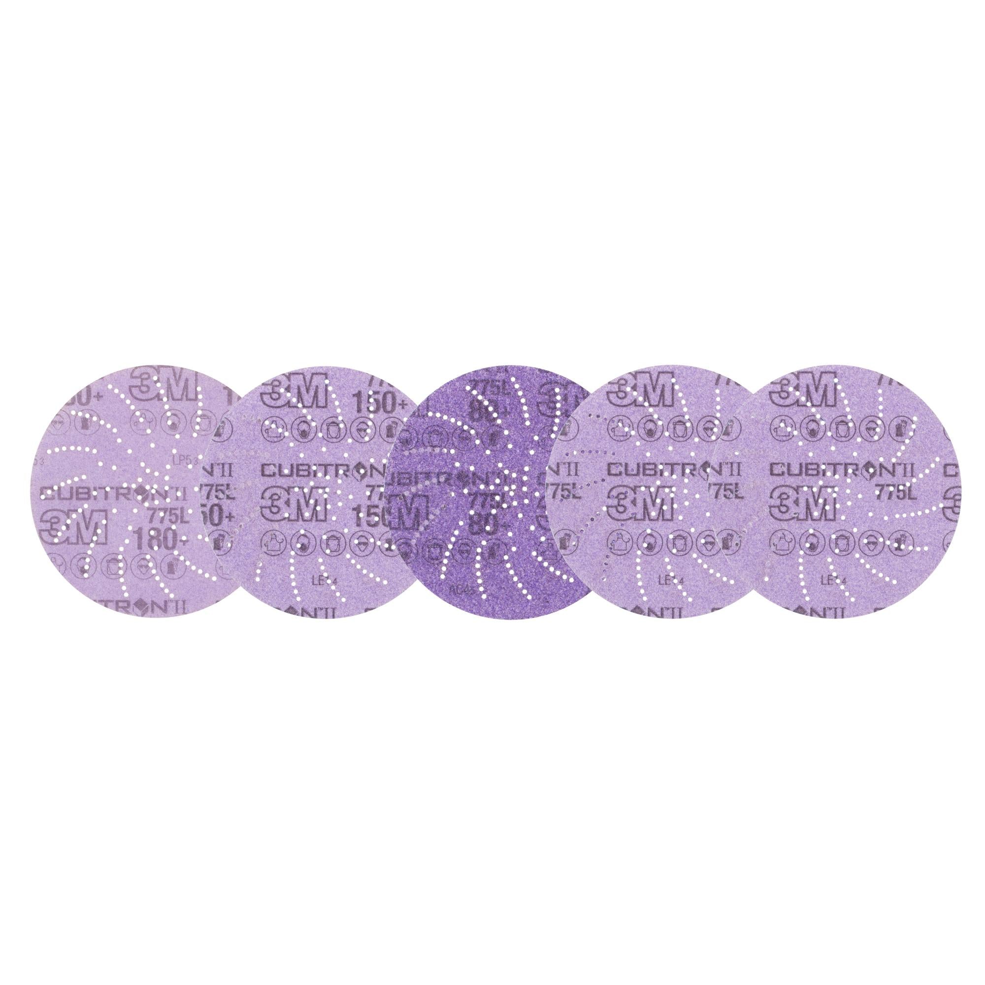 3M Xtract Cubitron II Disc 775L features a 3M proprietary multi-hole pattern for improved dust extraction in finishing applications. Part of the 3M Xtract Series, designed for optimal dust removal. An innovative multi-hole pattern extracts dust better than 5- or 6-hole products increasing cut and dramatically increasing disc life. The design does not need to align with the disc pad holes, making switching the discs fast, easy and convenient. Featuring ceramic 3M Precision-Shaped Grain, a revolutionary advancement in abrasive technology. The triangular shaped ceramic mineral is designed to slice through the substrate, rather than gouging or plowing like conventional abrasives, resulting in a disc that cuts up to 2x as fast as conventional abrasives. The film backing delivers outstanding tear resistance, flexibility and a consistent, uniform finish on a variety of substrates.These discs are ideal for a broad range of applications focused primarily on stock removal, and are effective on a wide variety of substrates, including metals, composites, gelcoat, and whitewood. The film backing offers greater tear resistance than paper discs, for additional durability and edge retention. For best results, pair with 3M Xtract™ Random Orbital Sanders.