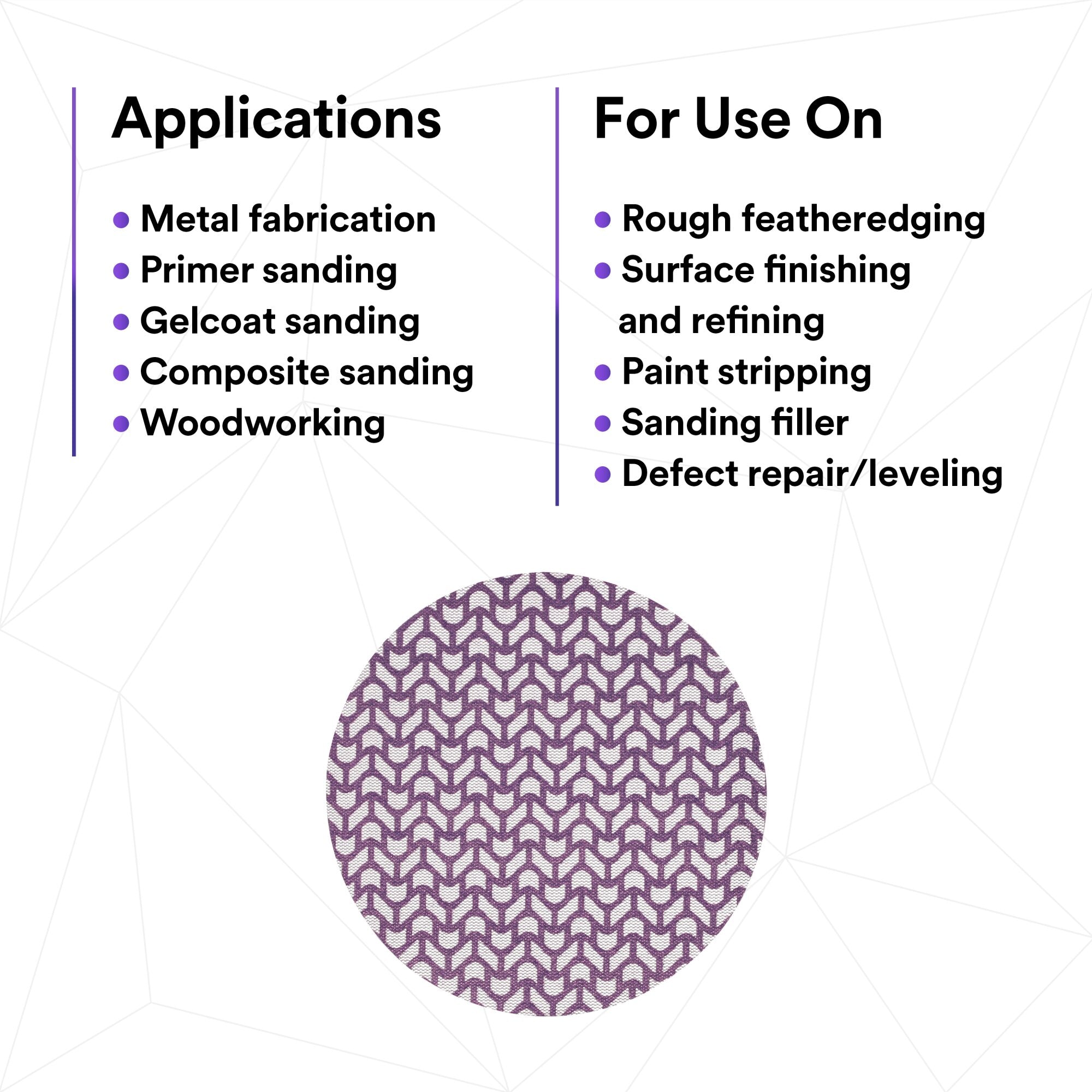 Dust extraction meets industry-leading cut-rate in 3M Xtract™ Cubitron™ II Net Disc 710W. This premium sanding disc features a unique abrasive pattern on a net backing that allows for virtually dust-free sanding, with legendary 3M Precision-Shaped Grain technology. You’ll finish more parts per disc with less dust in the environment, boosting productivity without sacrificing dust extraction.Sanding, reimagined. 3M has eliminated the tradeoff between dust extraction and disc performance. By combining legendary 3M Precision-Shaped Grain technology with a net backing, 3M Xtract™ Cubitron™ II Net Disc 710W achieves an industry-leading cut-rate while allowing for virtually dust-free sanding. Ceramic 3M Precision-Shaped Grain continually fractures into sharp cutting edges, delivering twice the abrasive life and cut-rate of leading competitor net discs. Take advantage of 3M Xtract™ Cubitron™ II Net Disc 710W to gain a competitive edge in your industry — from metal fabrication and woodworking to aerospace, marine, rail and automotive OEM operations. Enabling a safer work environment.A cleaner work environment is a safer work environment. 3M Xtract™ Cubitron™ II Net Disc 710W extracts up to 99% of dust produced during sanding and creating a cleaner, virtually dust-free work environment. Plus, the 3M Precision-Shaped Grain in the disc cuts with less pressure required by the operator, making for more comfortable sanding. Experience the benefits of the 3M Xtract™ Clean Sanding Solutions. 3M is your one-stop shop for all of your sanding application needs. From net discs to random orbital sanders and portable dust extraction units, we have everything you need to boost productivity and part quality in your operation. 3M technical experts have decades of application and industry expertise to ensure you get the right abrasives and the optimal system solution. Featured Applications Metal fabrication Primer sanding Gelcoat sanding Composite sanding Woodworking