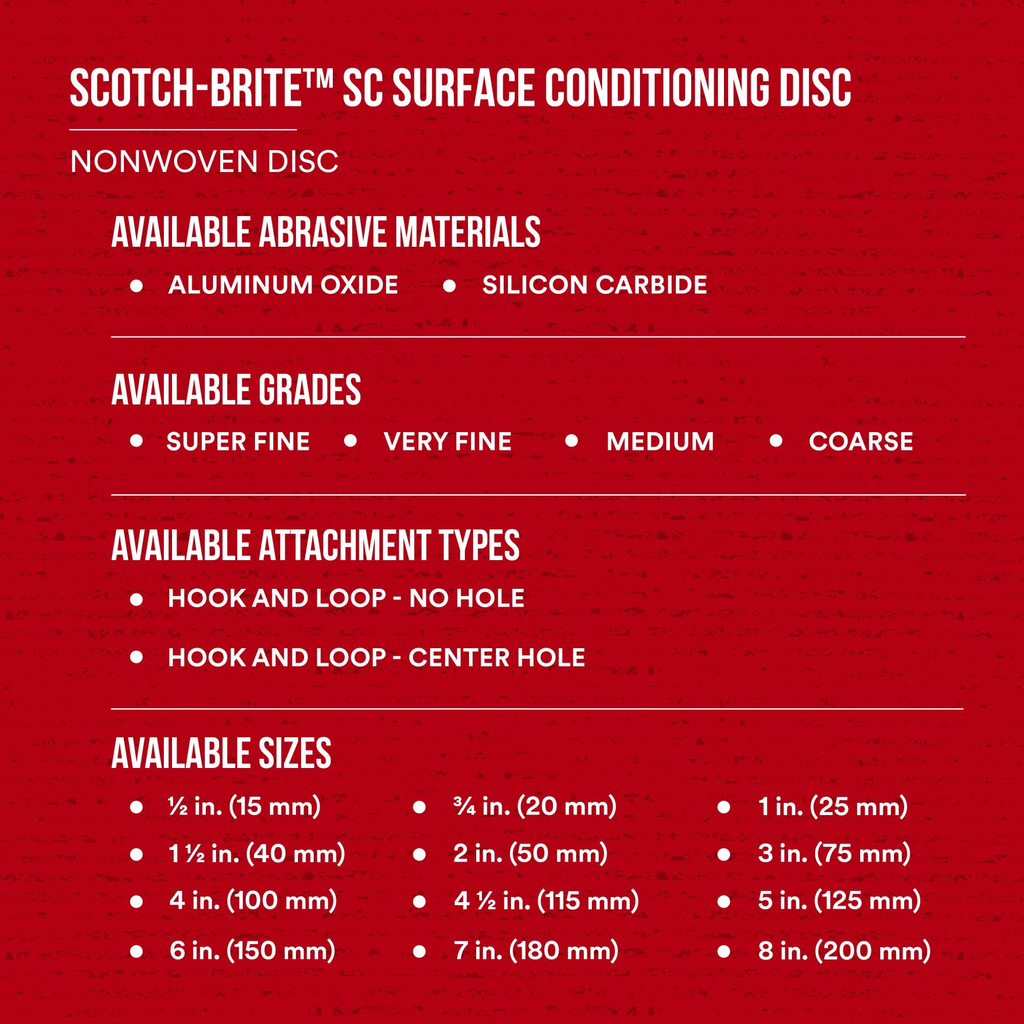 Scotch-Brite Surface Conditioning Disc comes in a wide variety of grades and sizes and is an ideal first-step for cleaning, blending, deburring, and finishing. Durable, non-woven fiber construction conforms well on irregular or contoured surfaces without undercutting or damaging the base material.The open-web material runs cool and resists loading to enable prolonged operation while evenly distributed aluminum oxide abrasives produce a high cut-rate for consistent finishing.